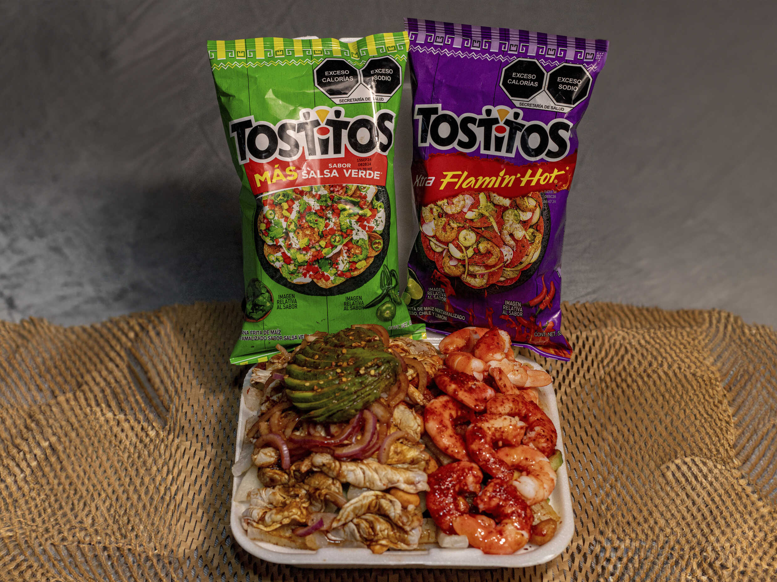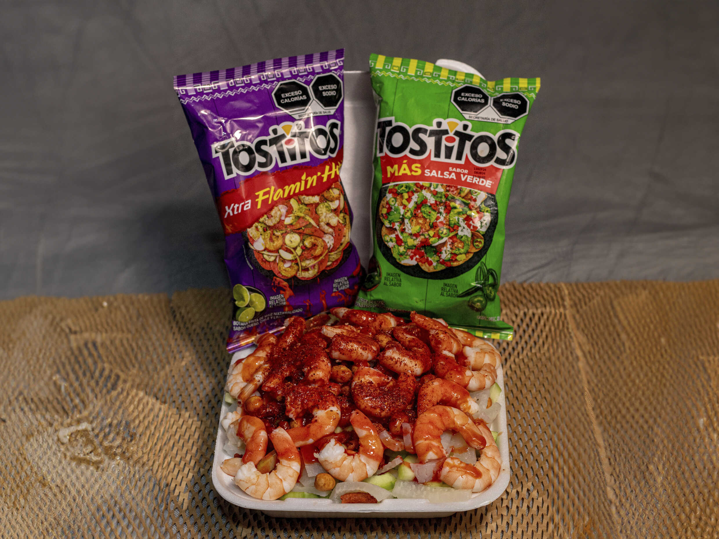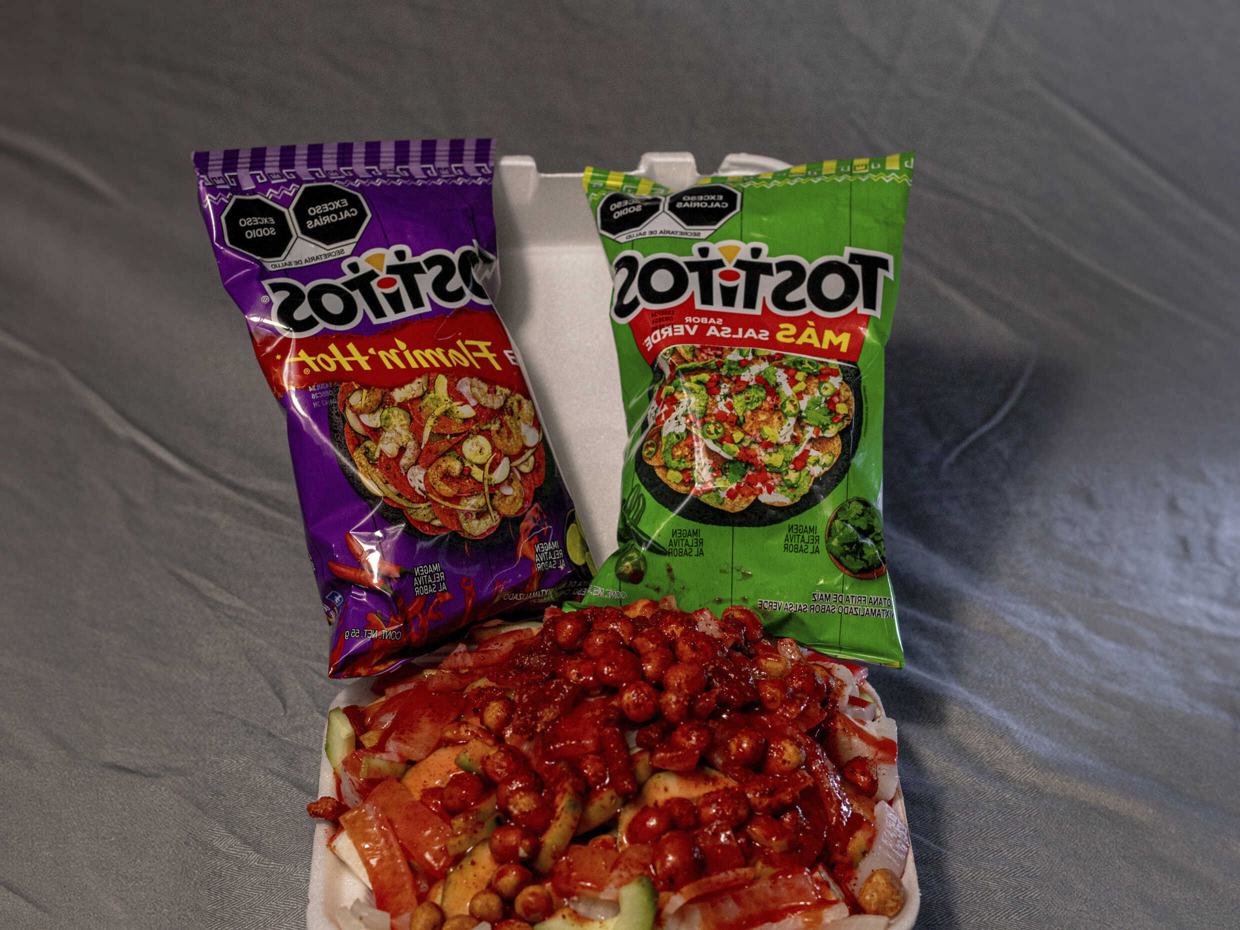 Tostitos Flaming Hot, pepino, jícama, cuerito, cacahuate, chaca chaca, Clamato, chile, chamoy y Tajín.