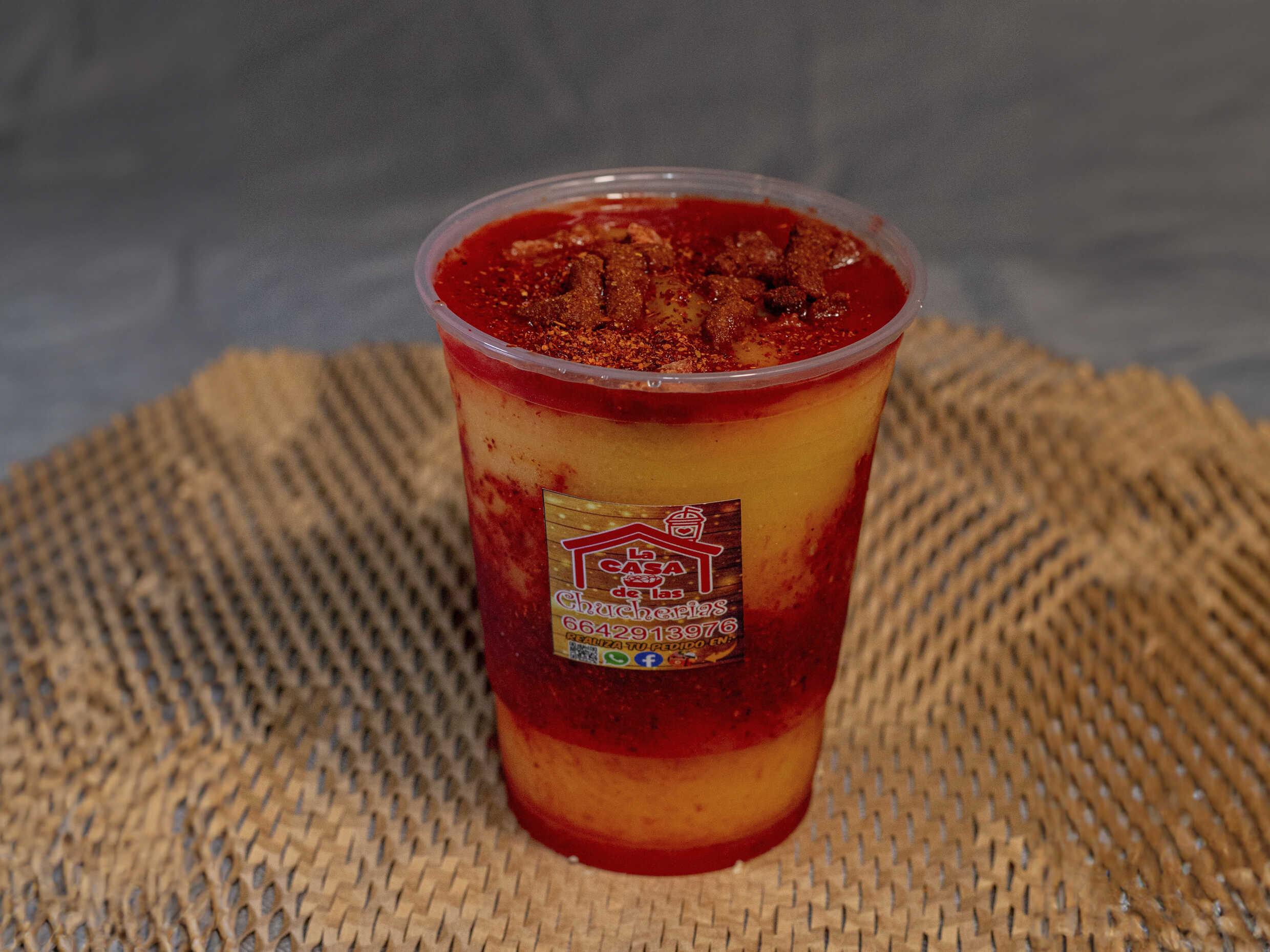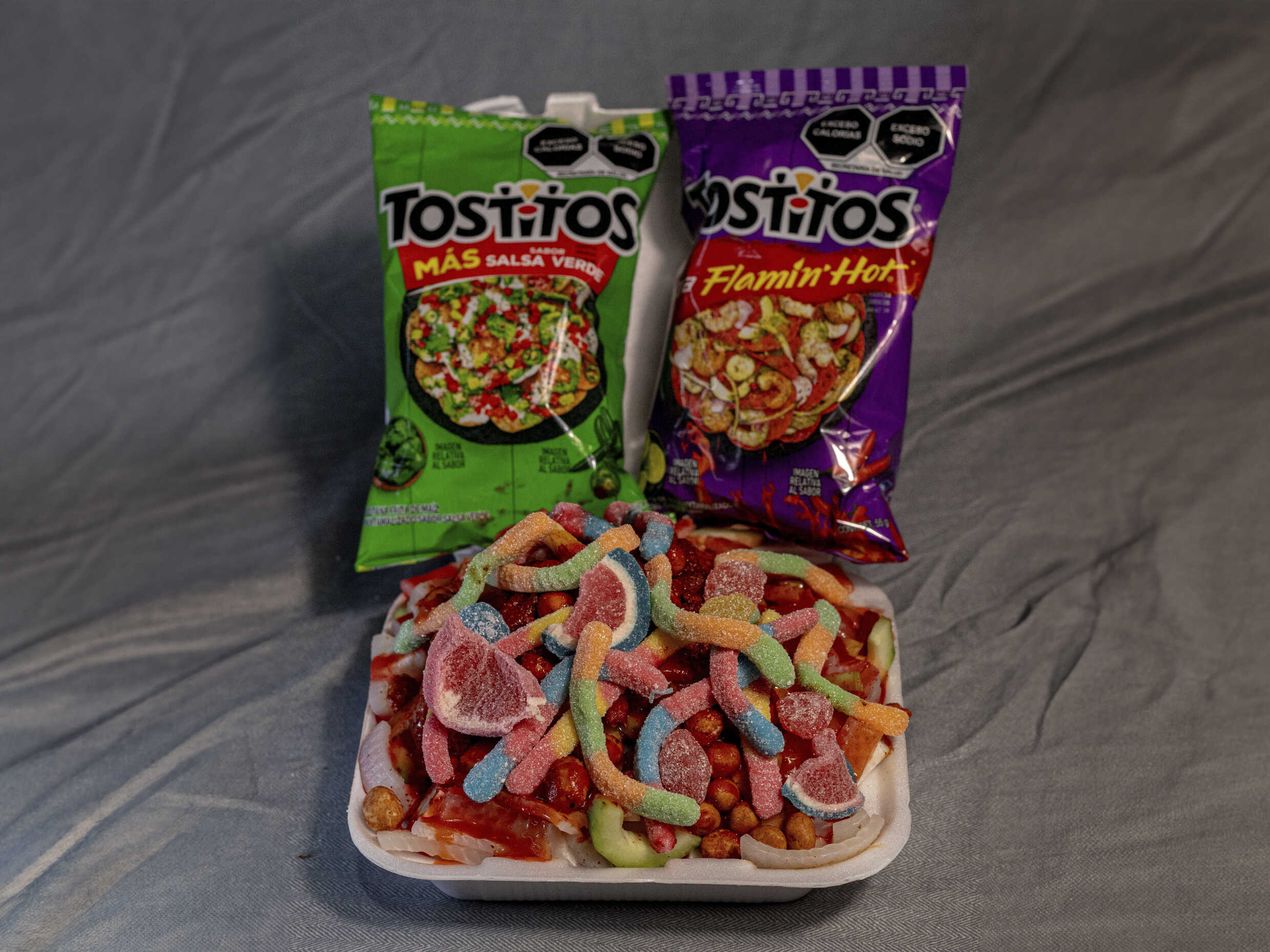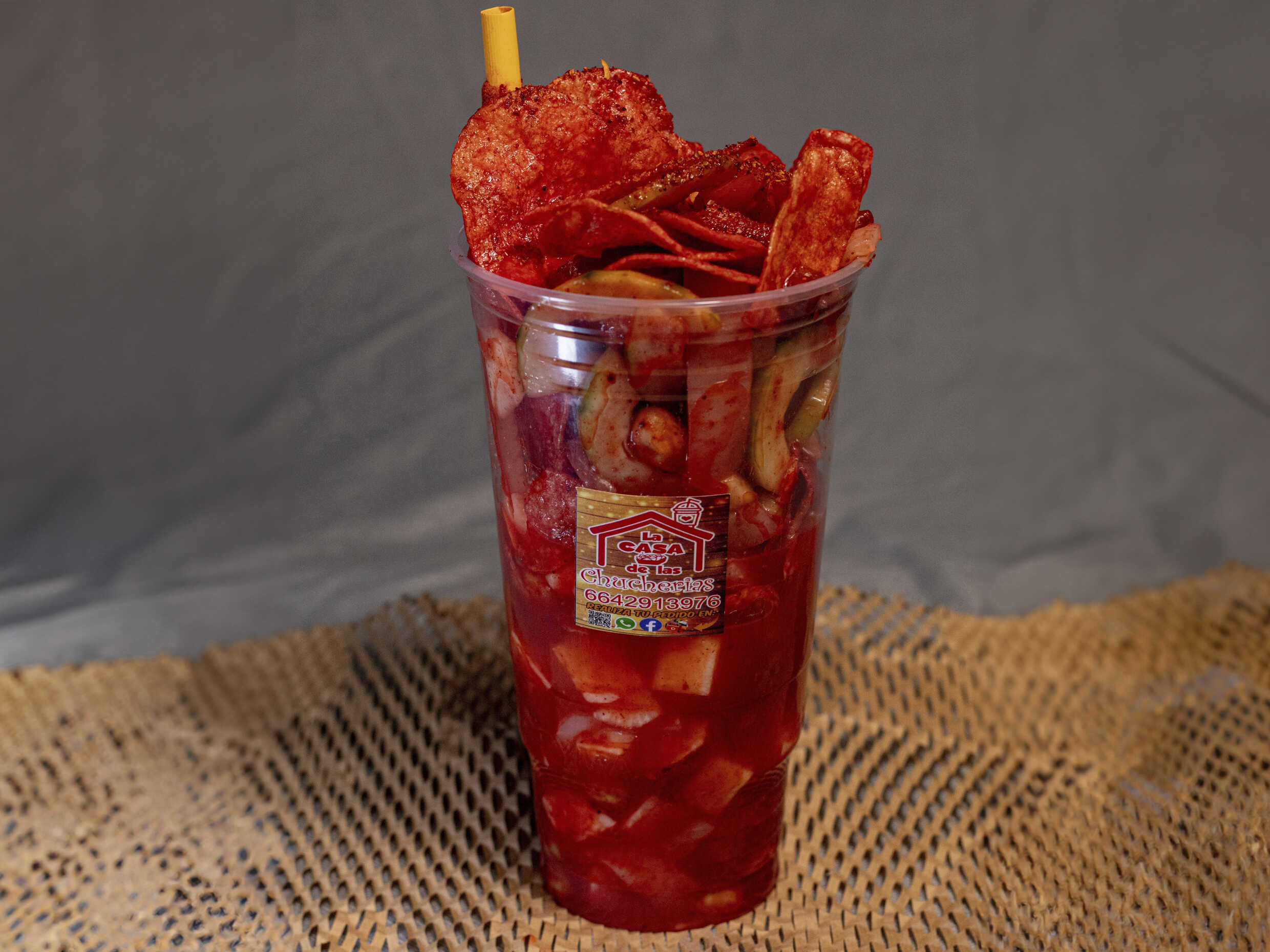 Tostitos Flaming Hot, pepino, jícama, cuerito, cacahuate, chaca chaca, Clamato, chile, chamoy y Tajín.