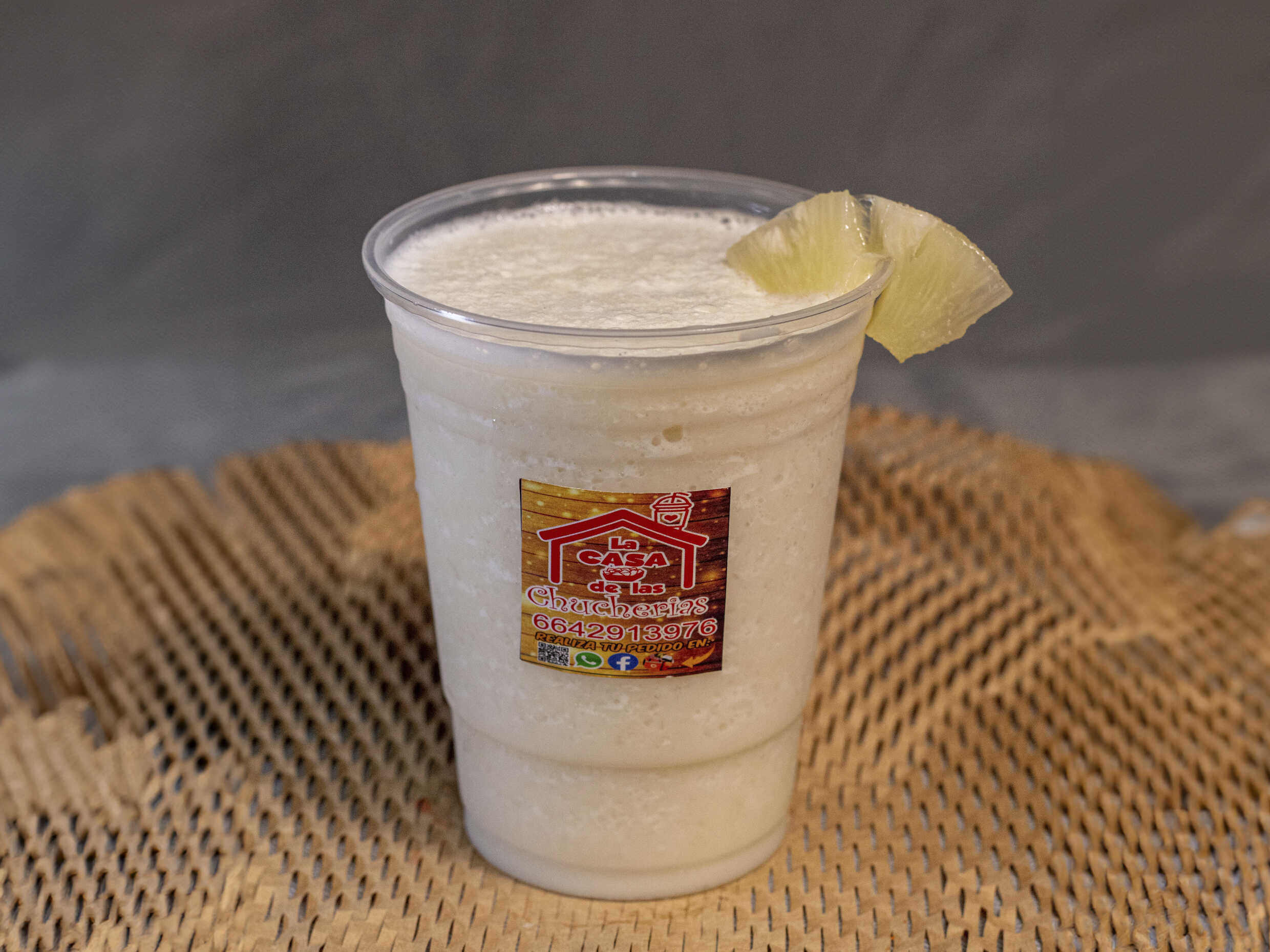 Hielo, shot de crema de coco, jugo de piña. Vaso de 16 oz.