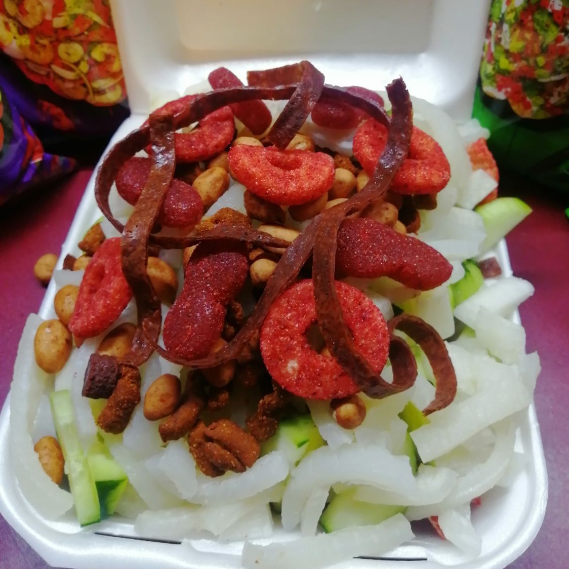 Cuerito, Jícama, peino, cacahuate,chaca chaca,Clamato, chile, chamoy y tajin