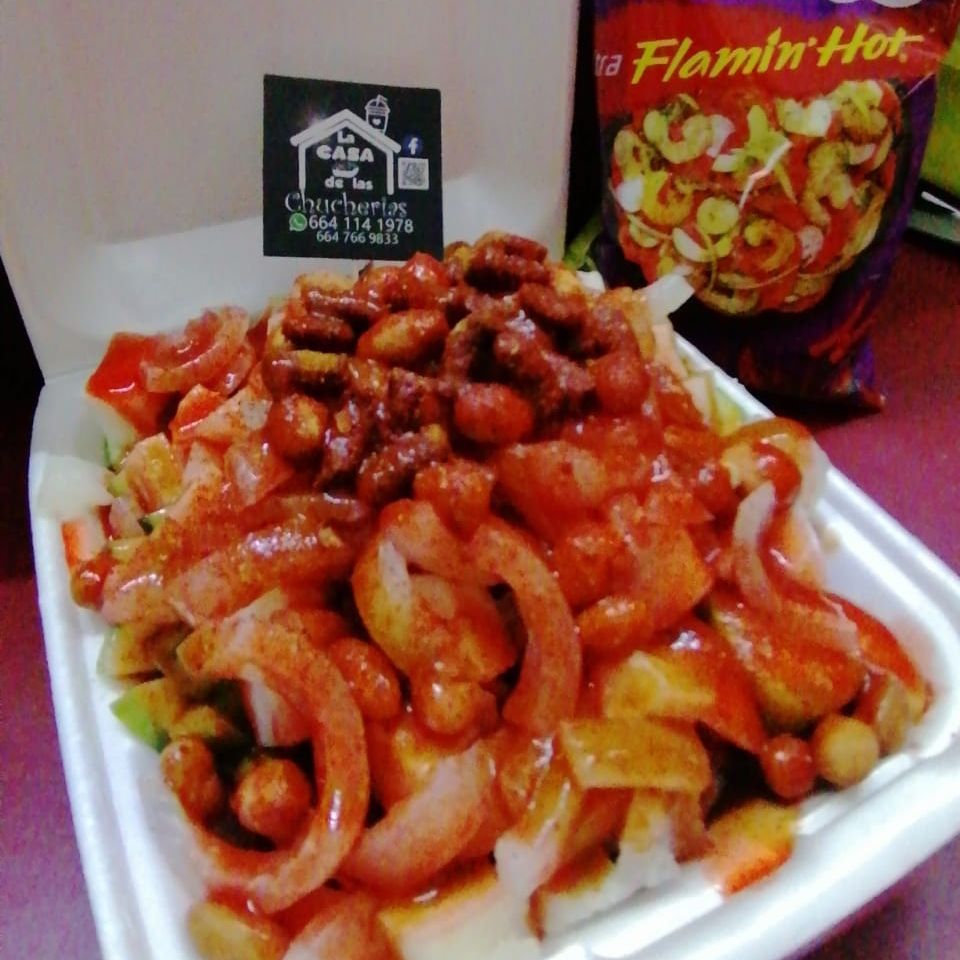 Tostito Flaming Hot, jícama, pepino, cueritos, cacahuates, chaca chaca, Clamato. Chile y chamoy.