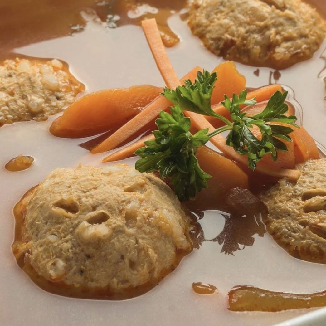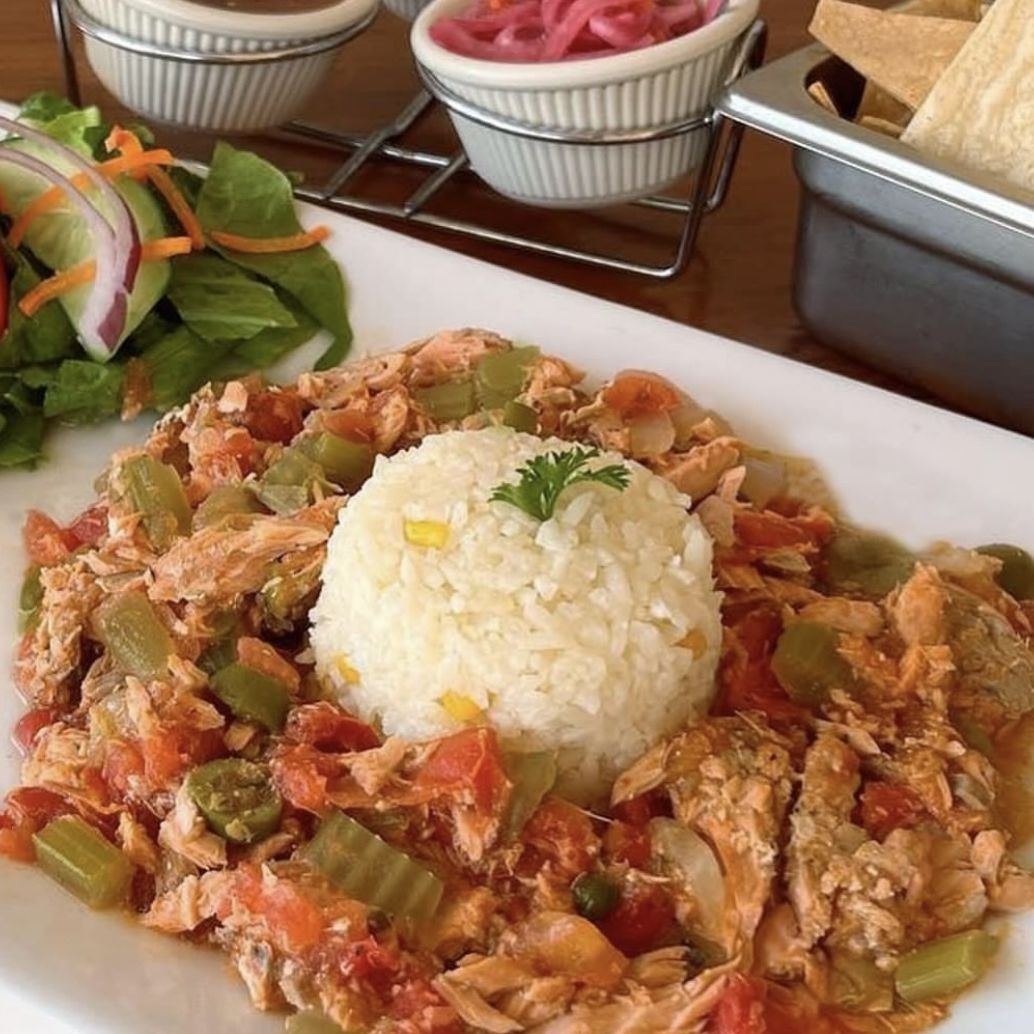 Salmón desmenuzado, sazonado con finas hierbas, guisado en consomé de salmón con verduras frescas.