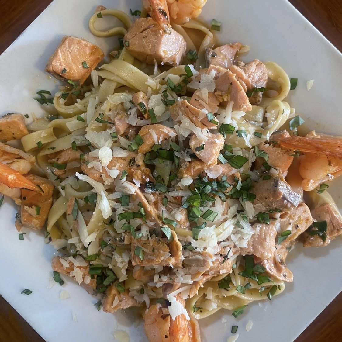 Pasta fetuccini acompañada de trozos de salmón y camarón flameados al vino blanco con un toque picante, acompañado de pan con ajo.