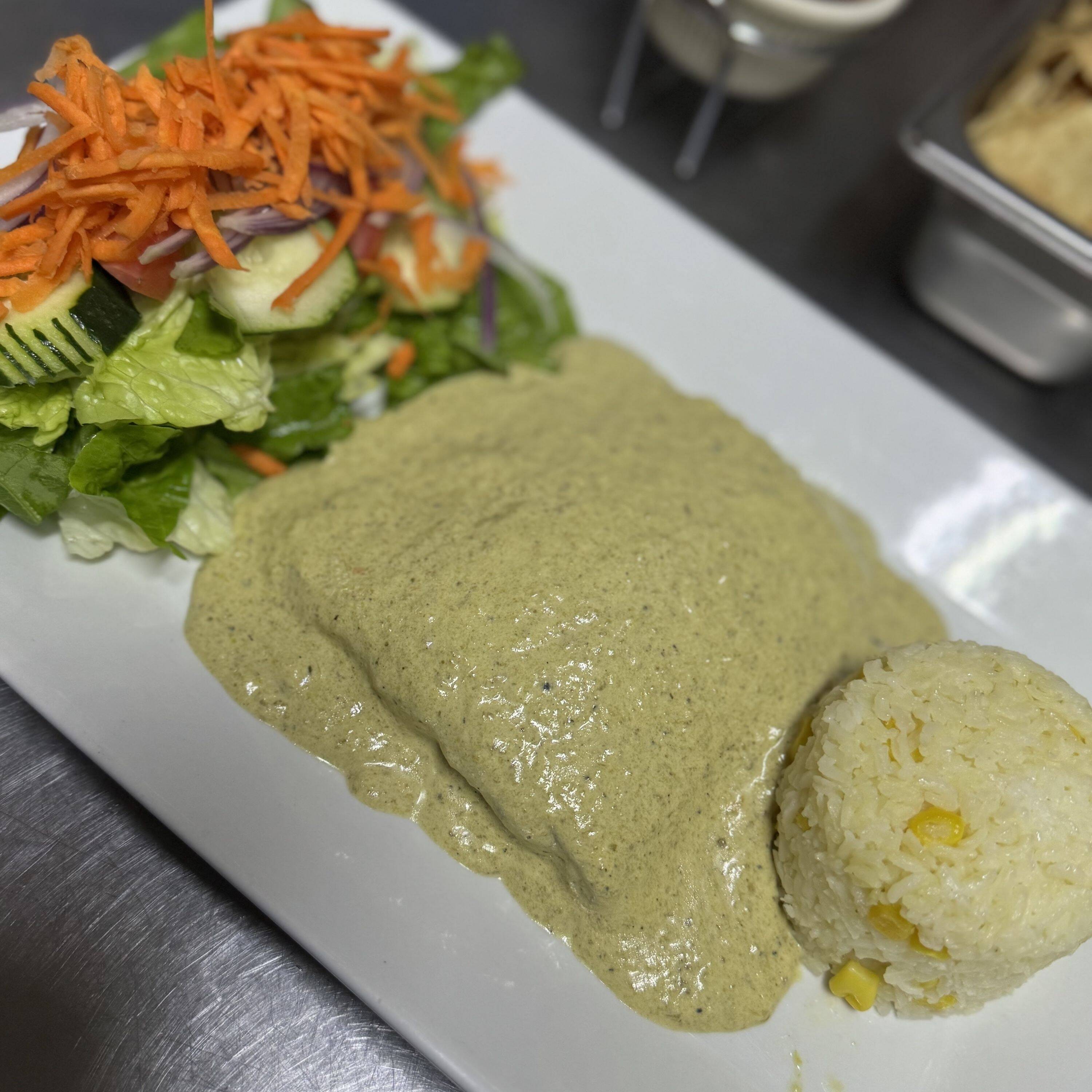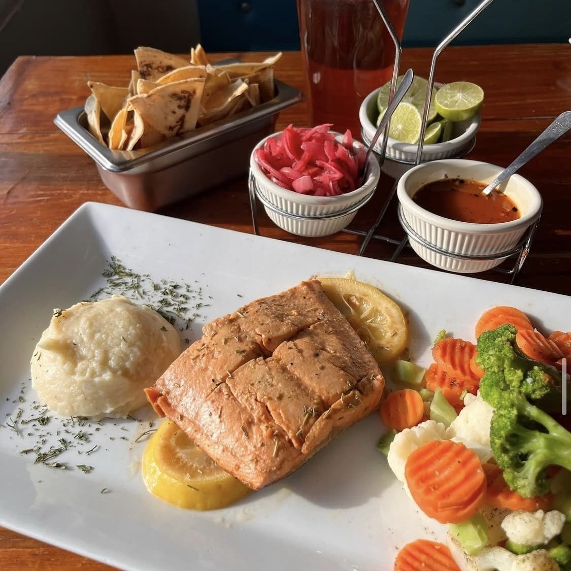 Tortilla de maíz dorada a las brasas, rellena de delicioso salmón sazonado con finas hierbas y guisado con verduras, acompañada del aderezo de la casa.