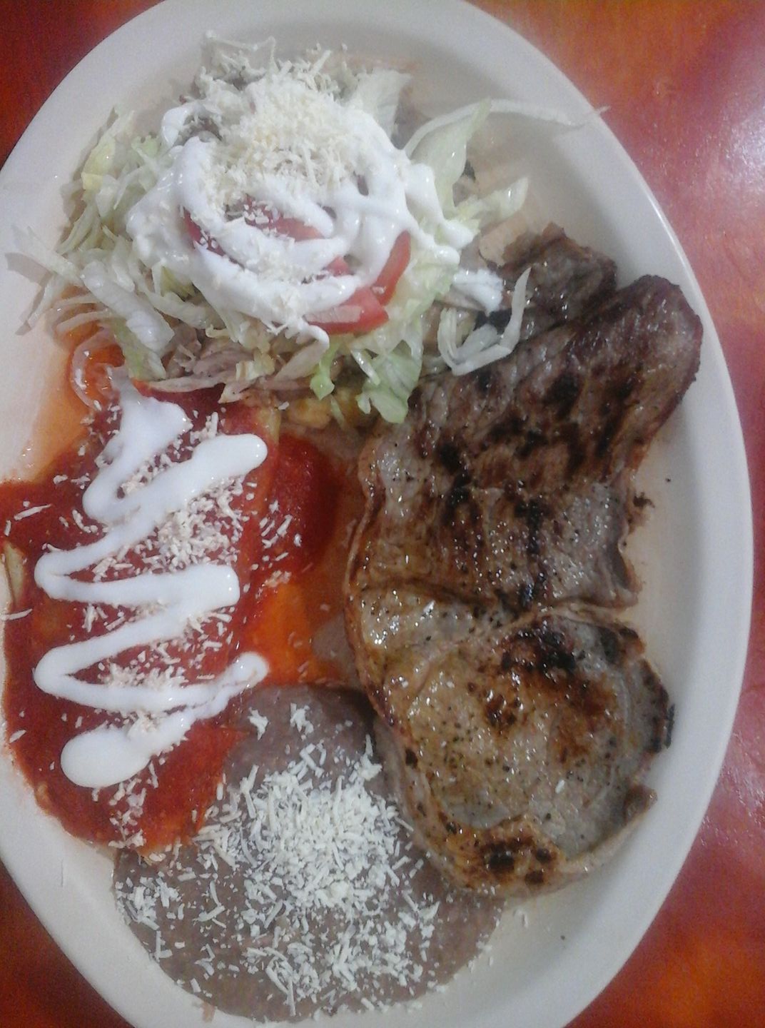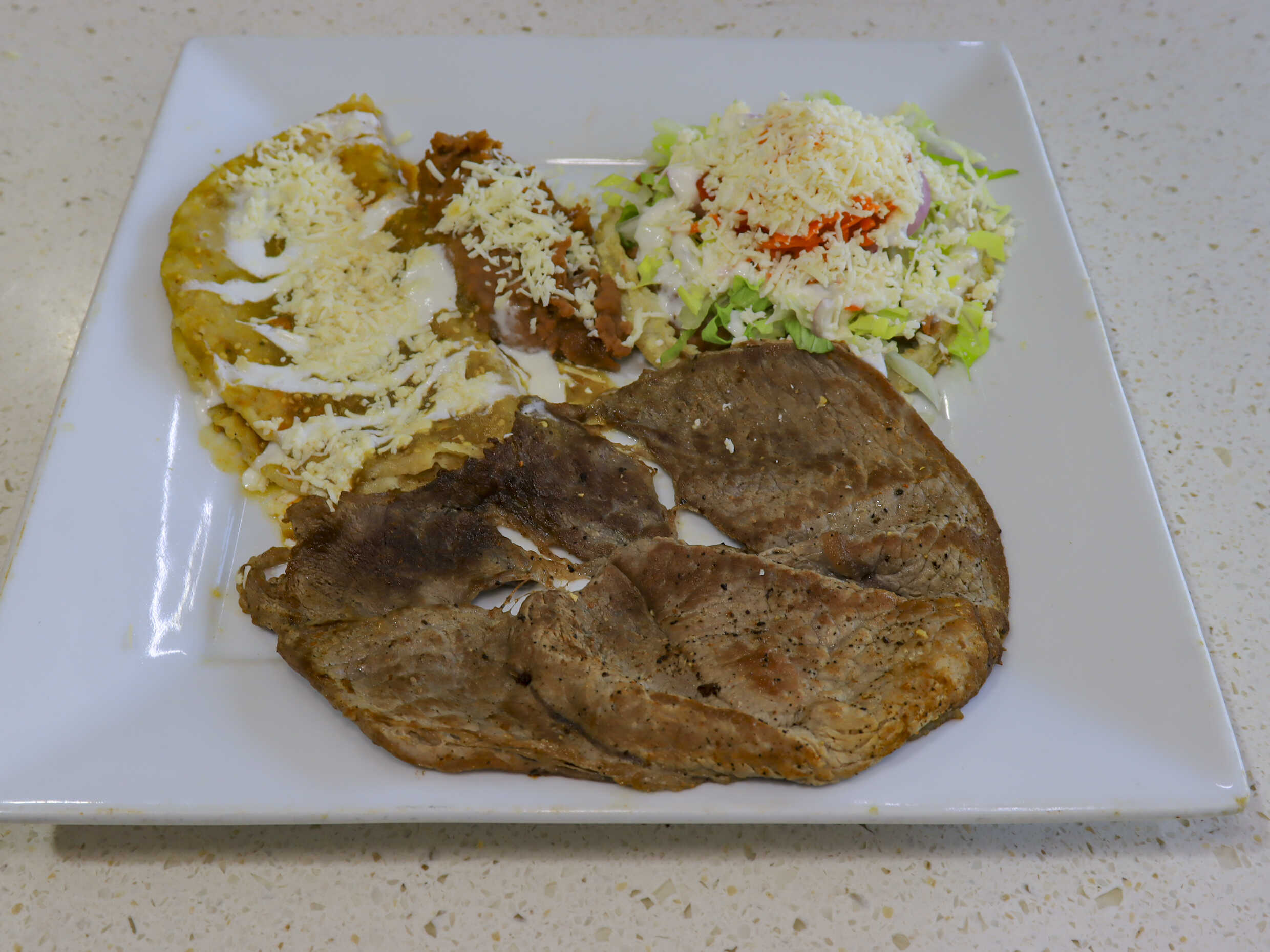 Ordena pechuga o asada, sope, enchilada y frijol.
