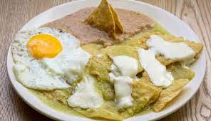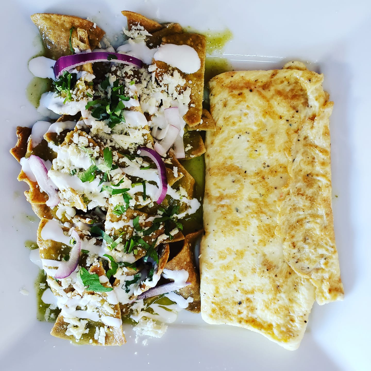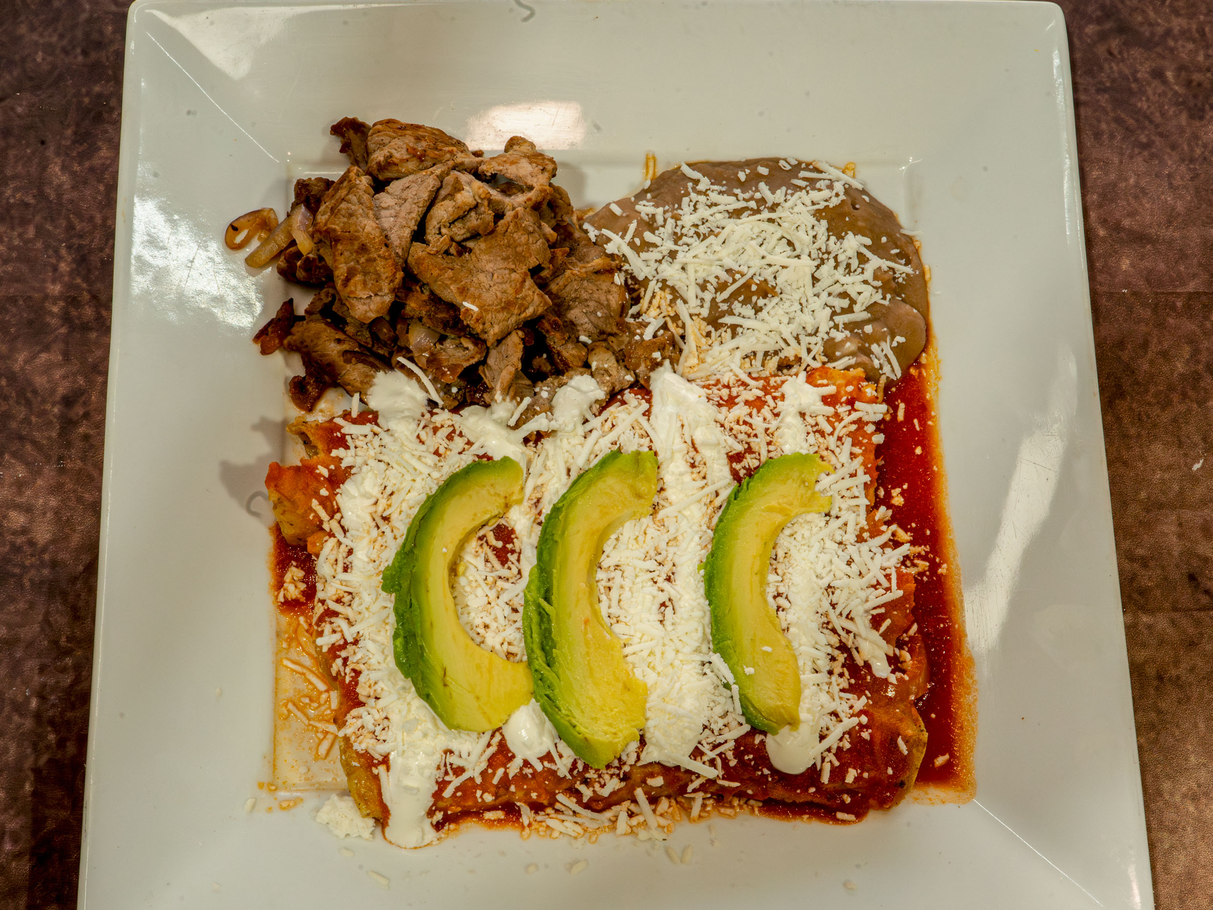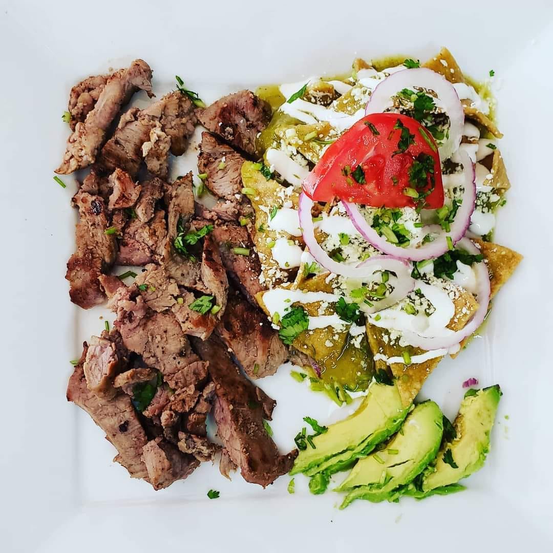Chilaquiles con arrachera rojos o verdes, totopos de maíz, carne de arrachera, aguacate, cebolla, cilantro, queso cotija y crema salsa roja o verde.