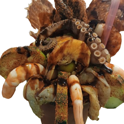 Base de ceviche camarón, camaron cocido pulpo y Takis.