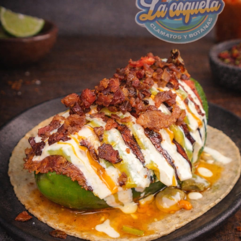 chile california relleno de marlín con toping de camaron enchilado y tocino en trozo, con aderezos de la casa.