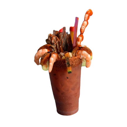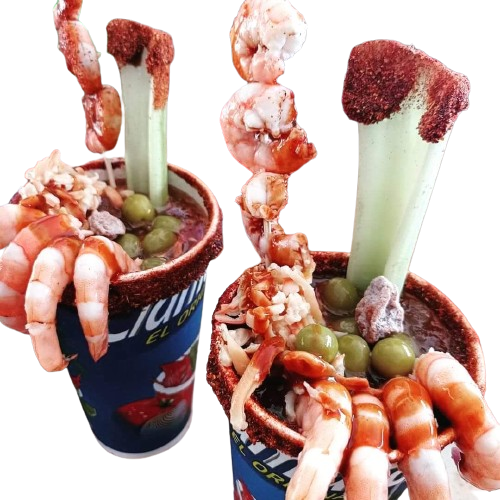 clamato con salsas de la casa, camaron cocido, crudo y seco, almeja picada, aceitunas,carne seca,pulpo,y saladito