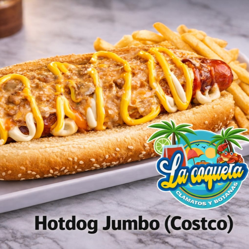 hot dog jumbo con salchicha de costco con aderezos de la casa