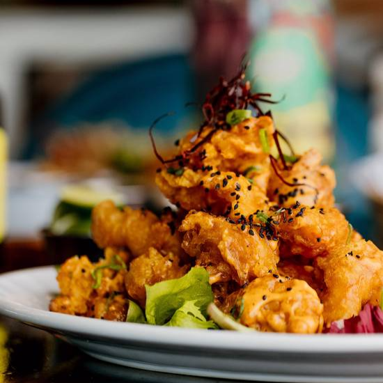 Camarón Crujiente + Arroz Blanco + Alioli + Ponzu