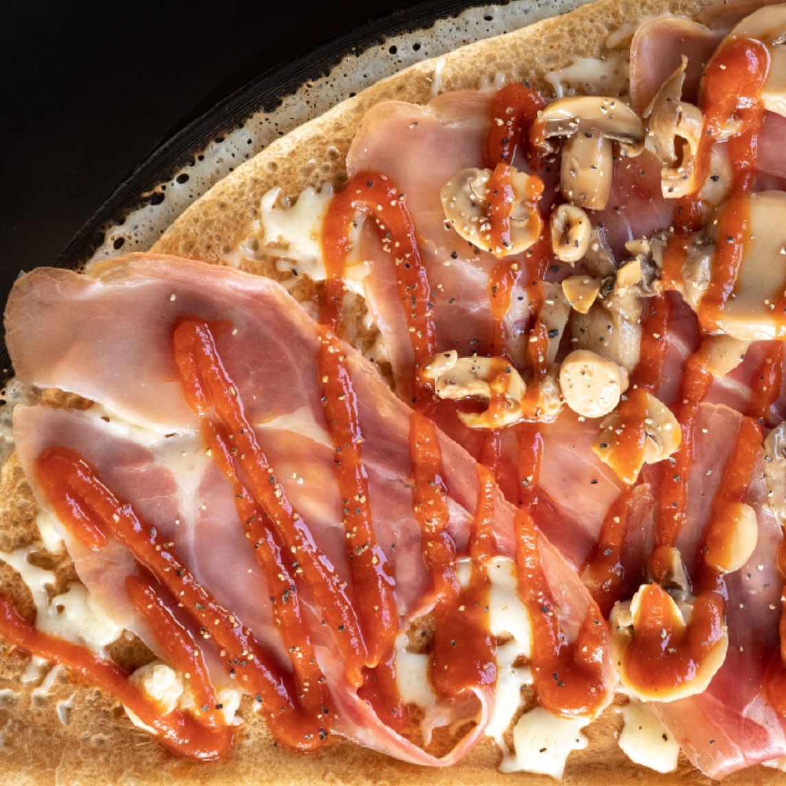 Rellena de queso Gouda, prosciutto, champiñones y salsa de tomate marinara.