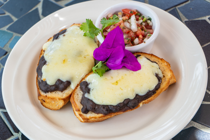 Frijol negro refrito, queso tipo asadero y salsa mexicana