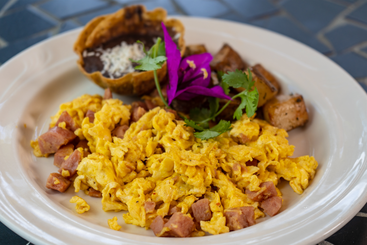 Huevo revuelto con carne deshebrada estilo ranchero, acompañado de 2 tortillas de harina