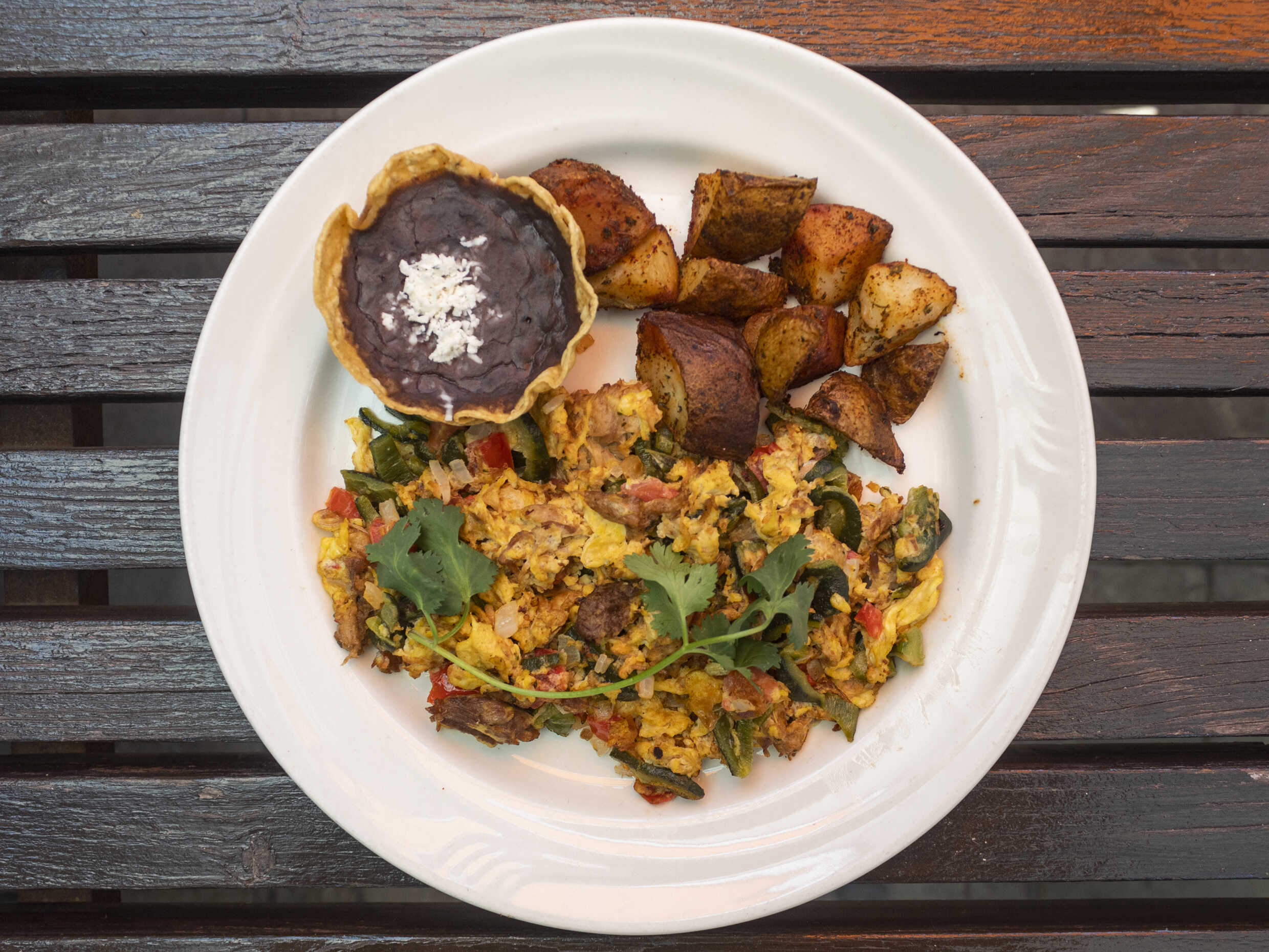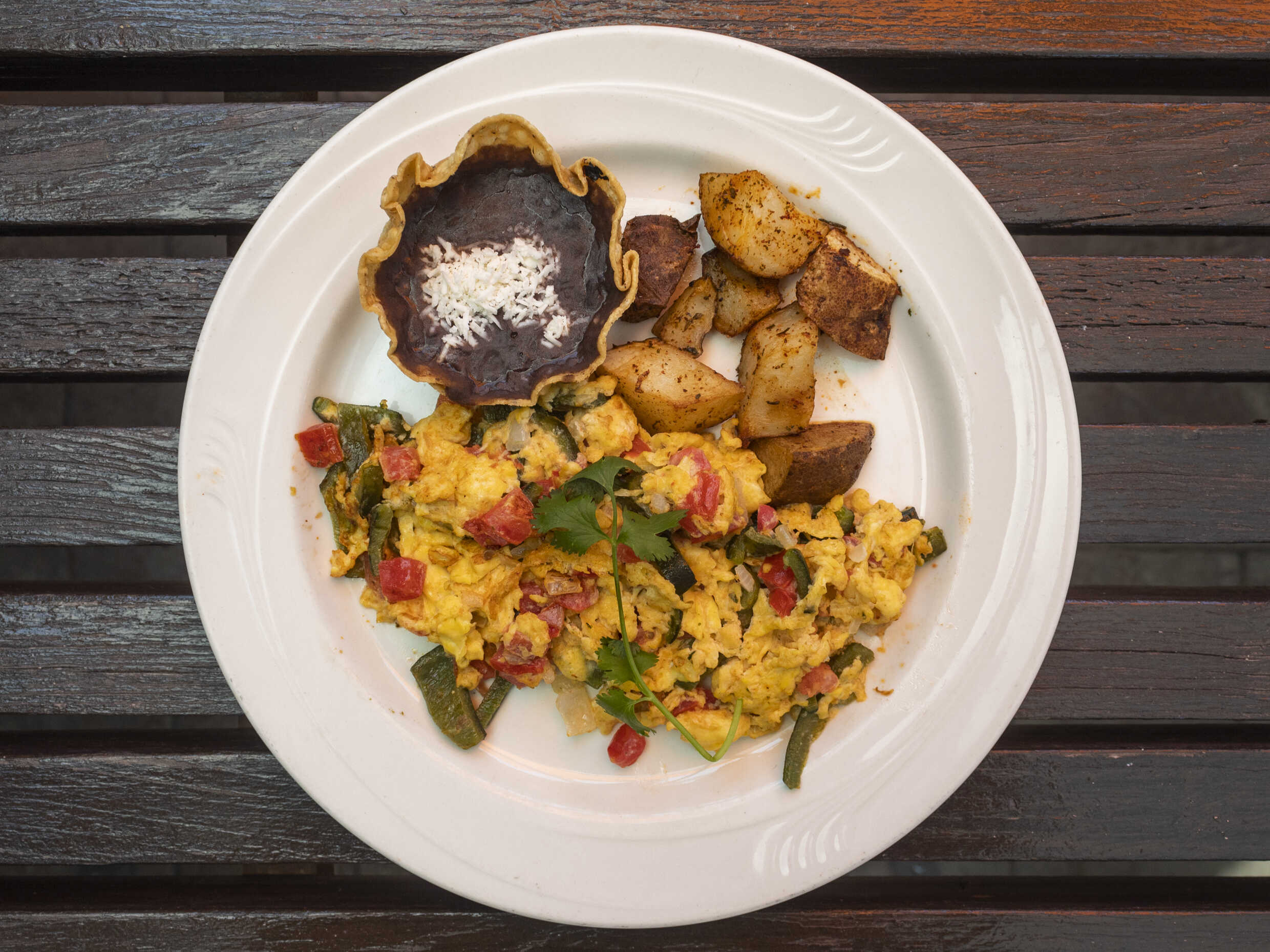 Salsa de tomate, rajas poblanas, cebolla, cilantro, gratinados (Acompañado de frijolitos La Diferecia y huevo al gusto))