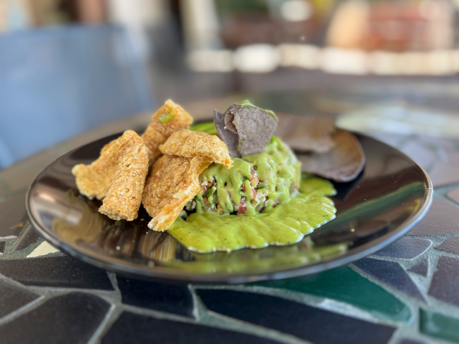Nopal, tomate, cebolla, aguacate, chicharrón, queso cotija y aderezo de cilantro