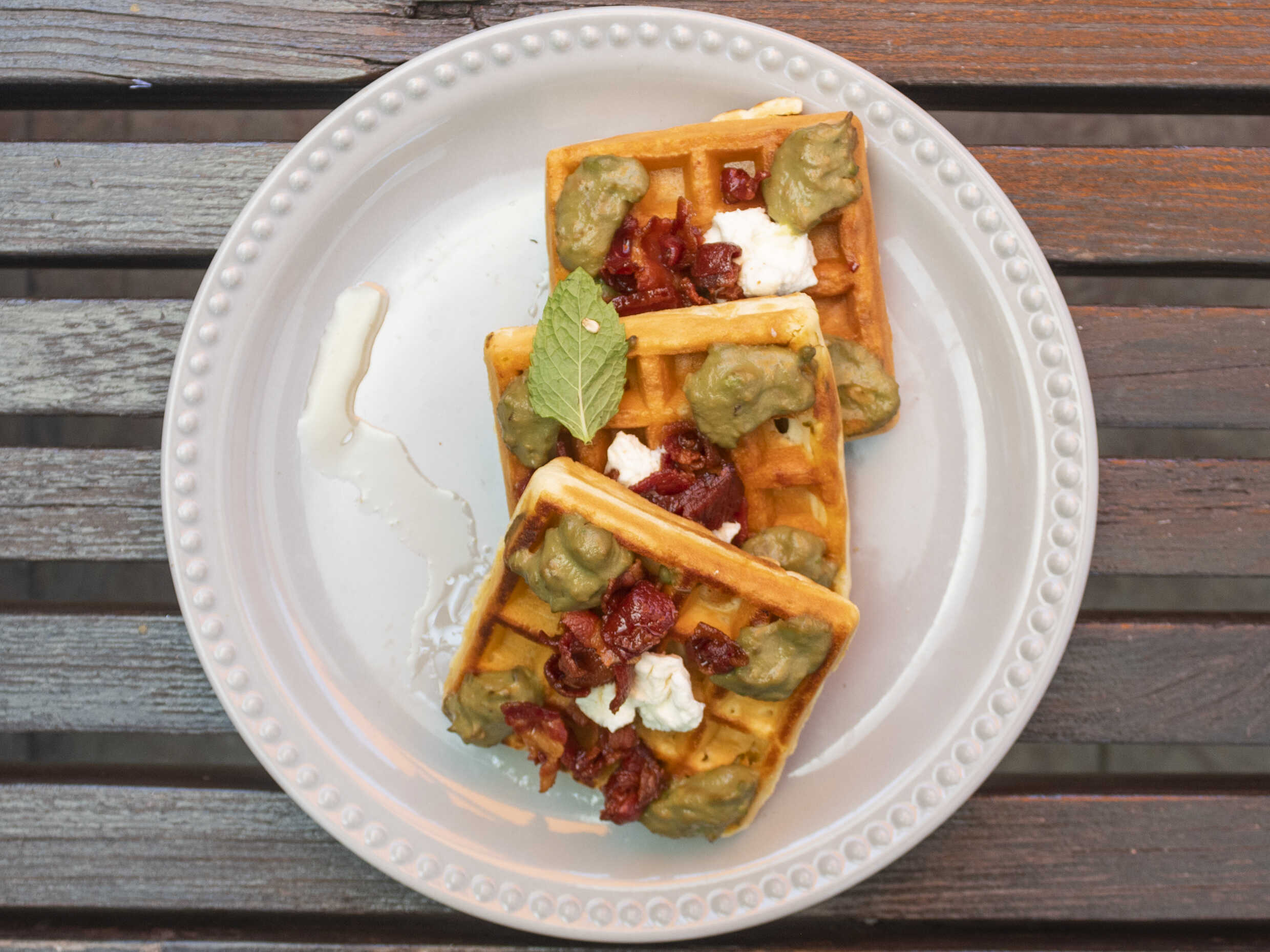 Waffle con queso de cabra, aguacate, tocino caramelizado con miel de agave
