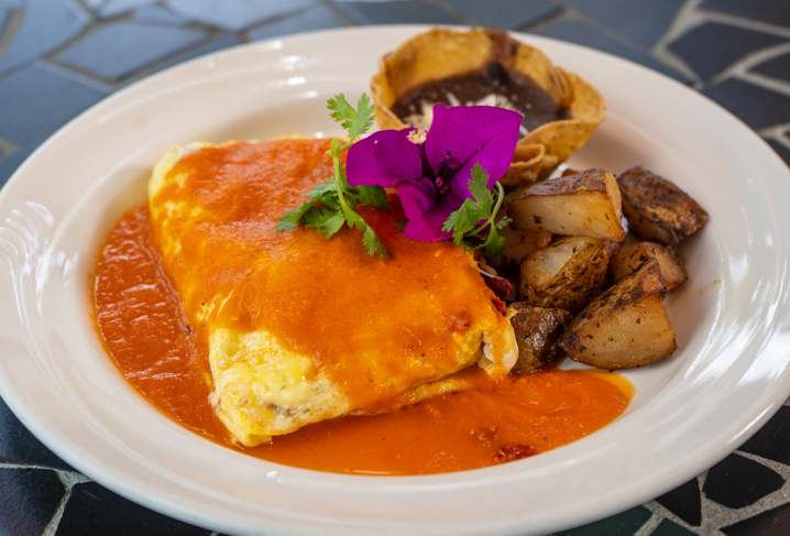 Omelette de clara de huevo relleno de nopales y queso fresco (Acompañado de frijolitos La Diferecia y papa leonesa)