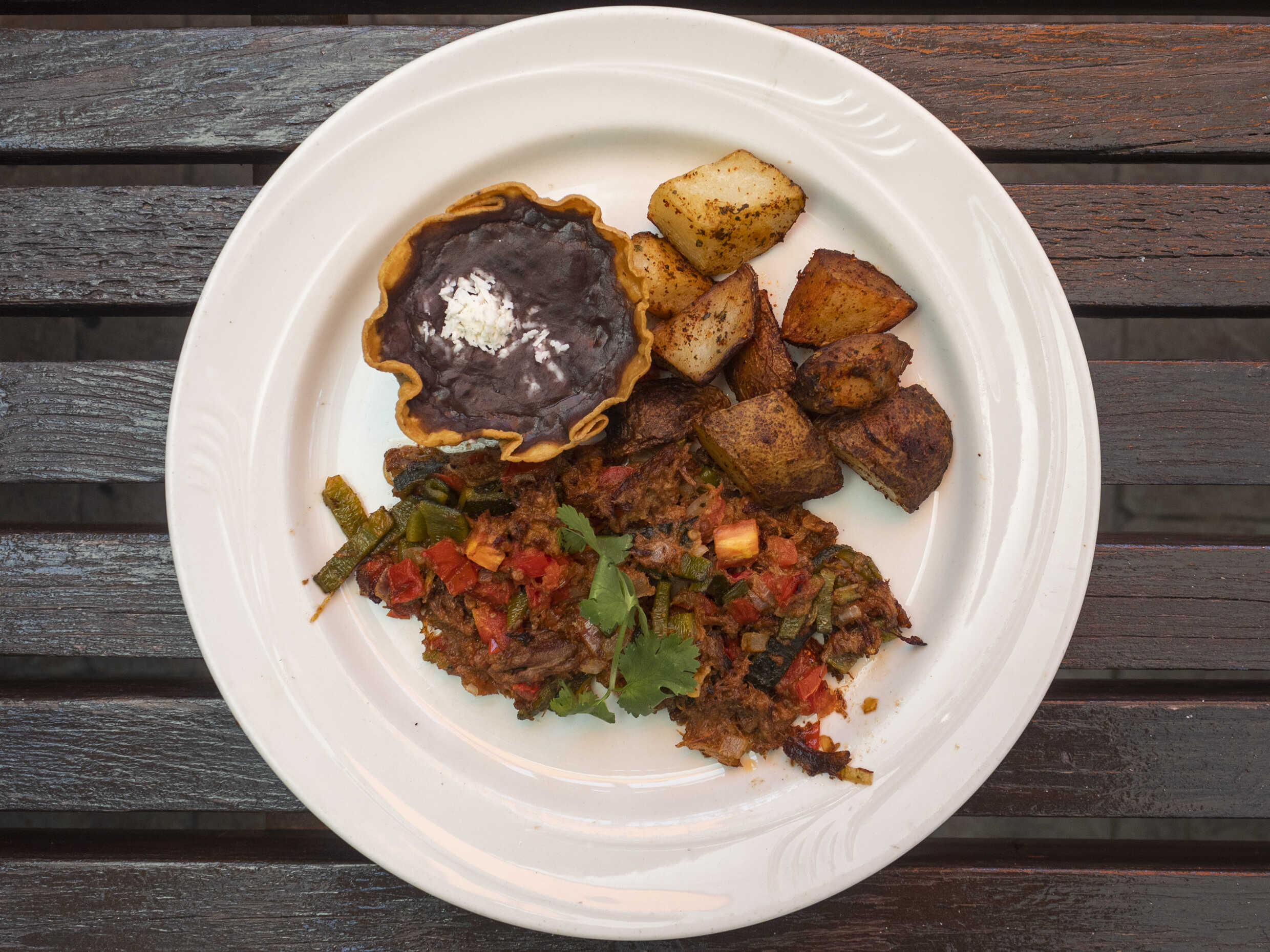 Carne deshebrada, cebolla, tomate y rajas poblanas