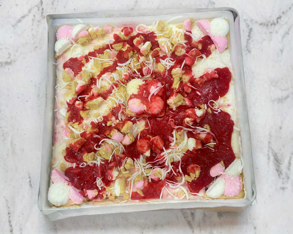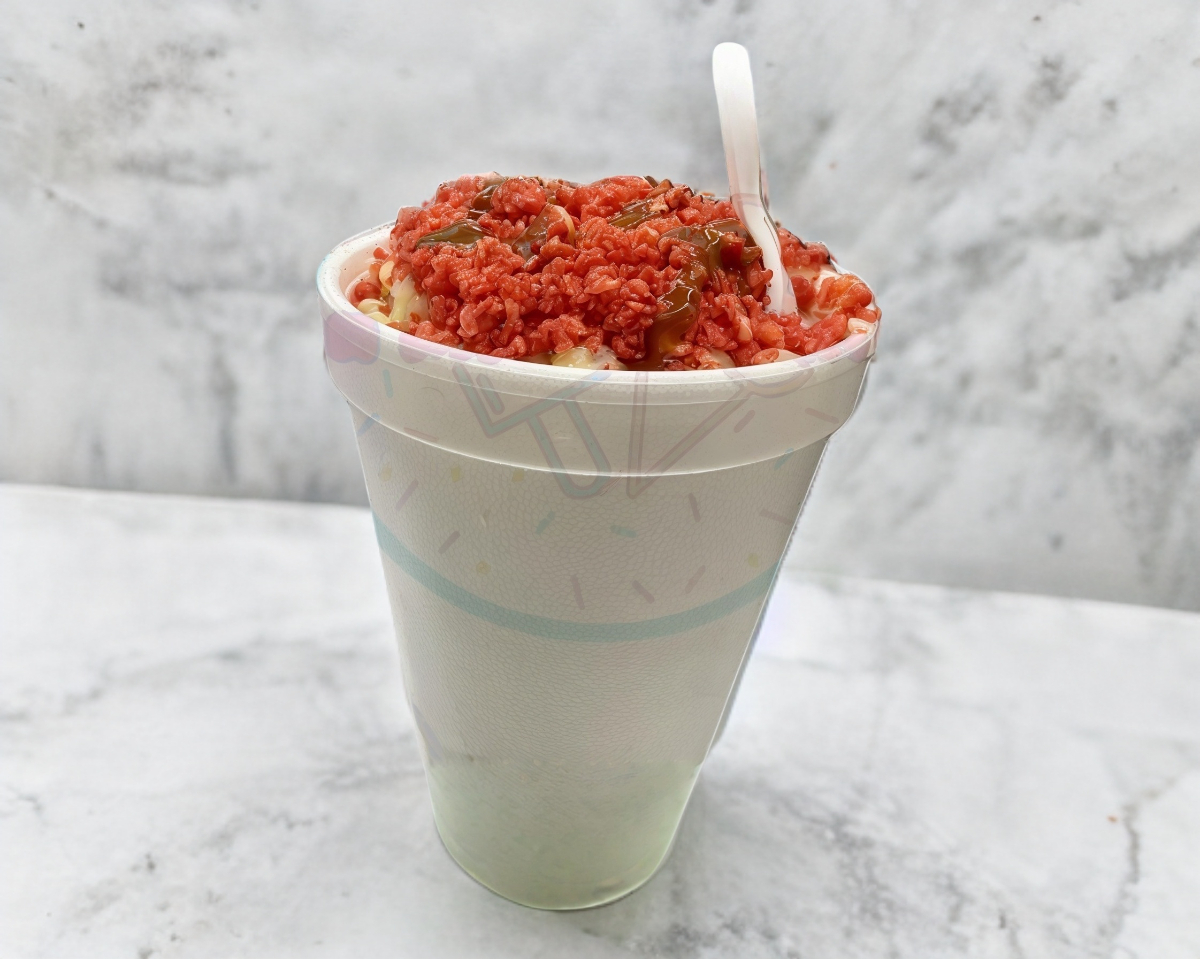 Fresas congeladas con crema, cereales, lechera, crema batida y chocolate liquido.
