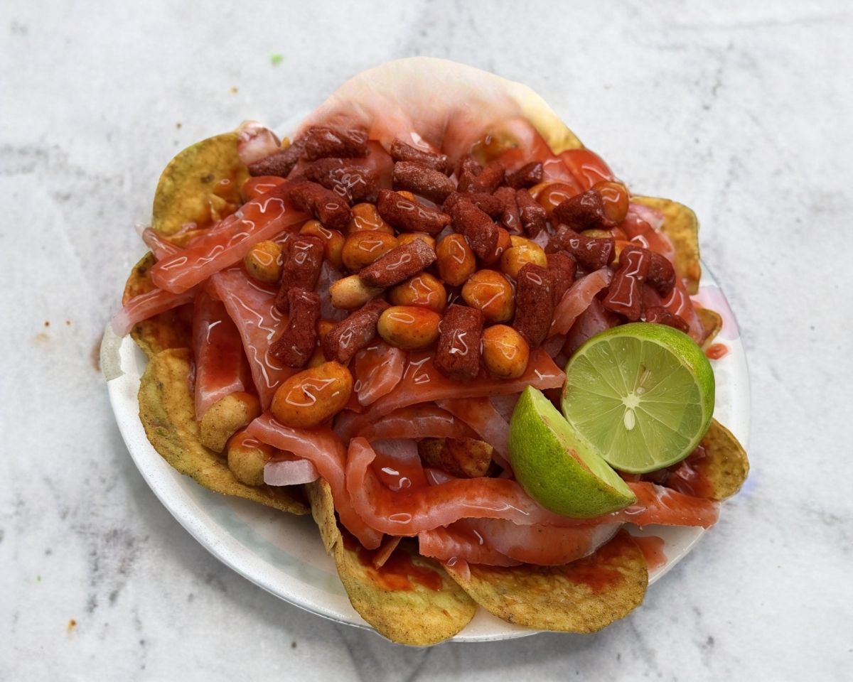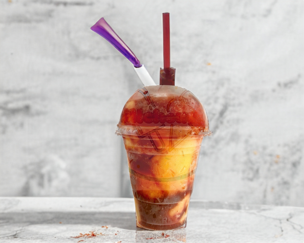 Tostitos, pepino, jicama, cueritos, cacahuate japones, chaca-chaca, clamato, salsa, chamoy, tajin y un tarugo.