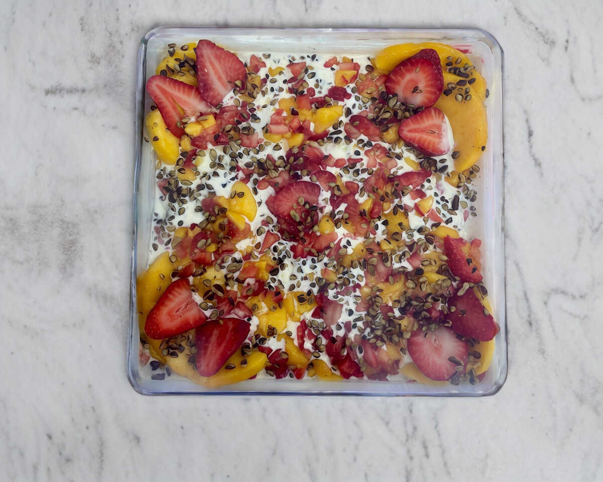 Fruta, cereales, miel y queso cottage.