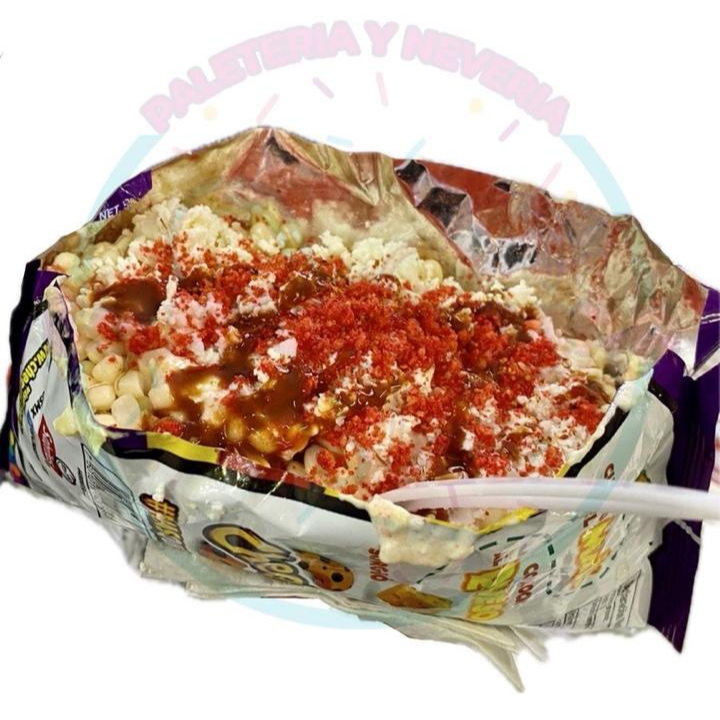 Sabritas de su eleccion con elote, mantequilla, mayonesa, crema, queso cotija, cheetos molidos, aderezo chipotle, salsa, tajin y limon.
