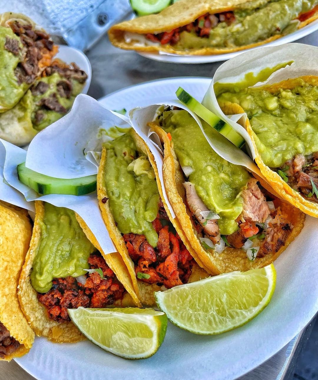 Tortilla hecha a mano, carne asada, cebolla, cilantro, guacamole y salsa.