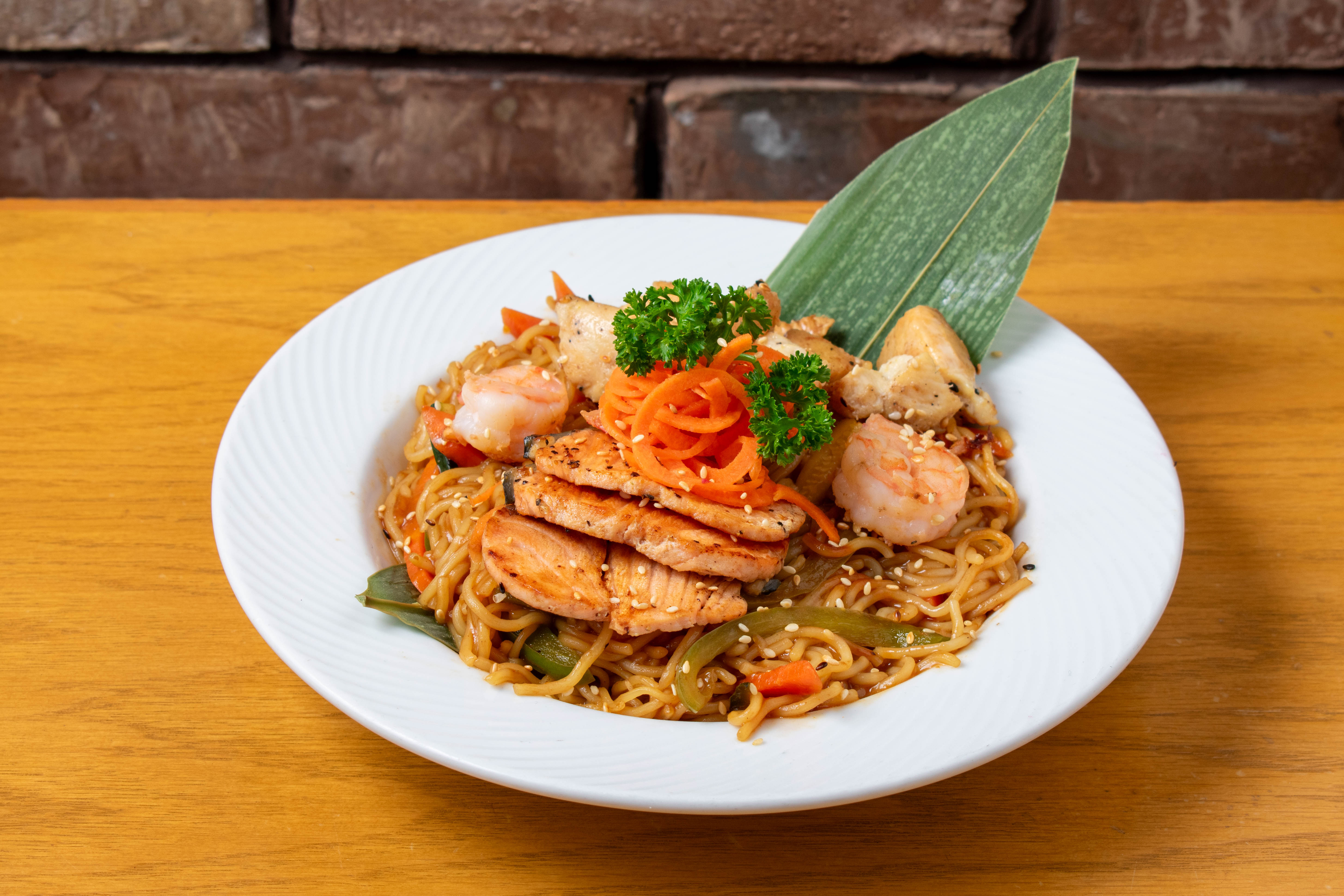 pasta yakisoba salteada con pollo, salmón y camarones,verduras frescas como brócoli, calabaza, zanahoria, champiñón, espárragos y morrón verde. Todo bañado en una salsa spicy