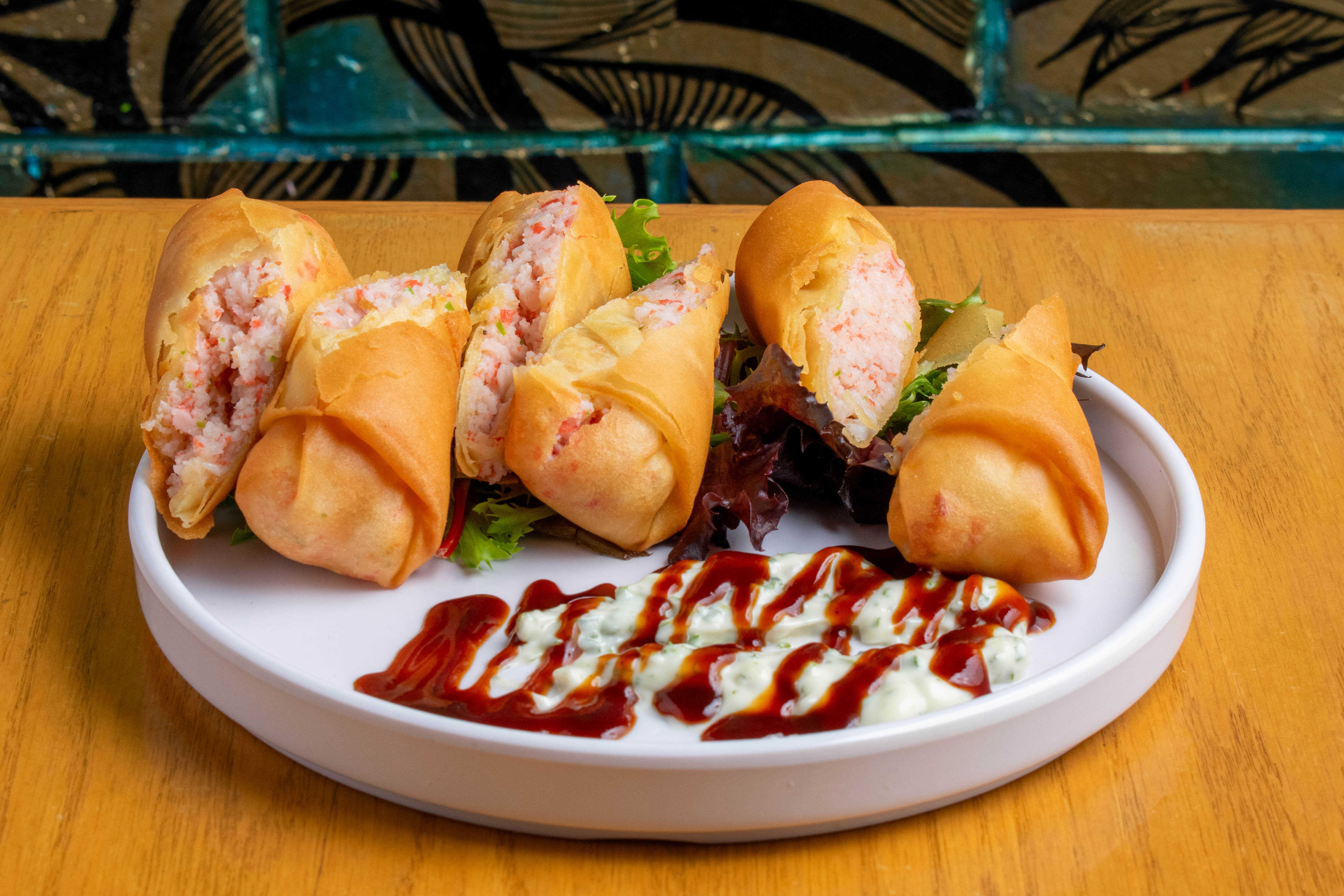 rollos envueltos en hoja de huevo, rellenos con tampico, queso crema, cebollín y camarón o res. Sazonados con especias orientales como ajinomoto, hondashi y pimienta, y decorados con ajonjolí.