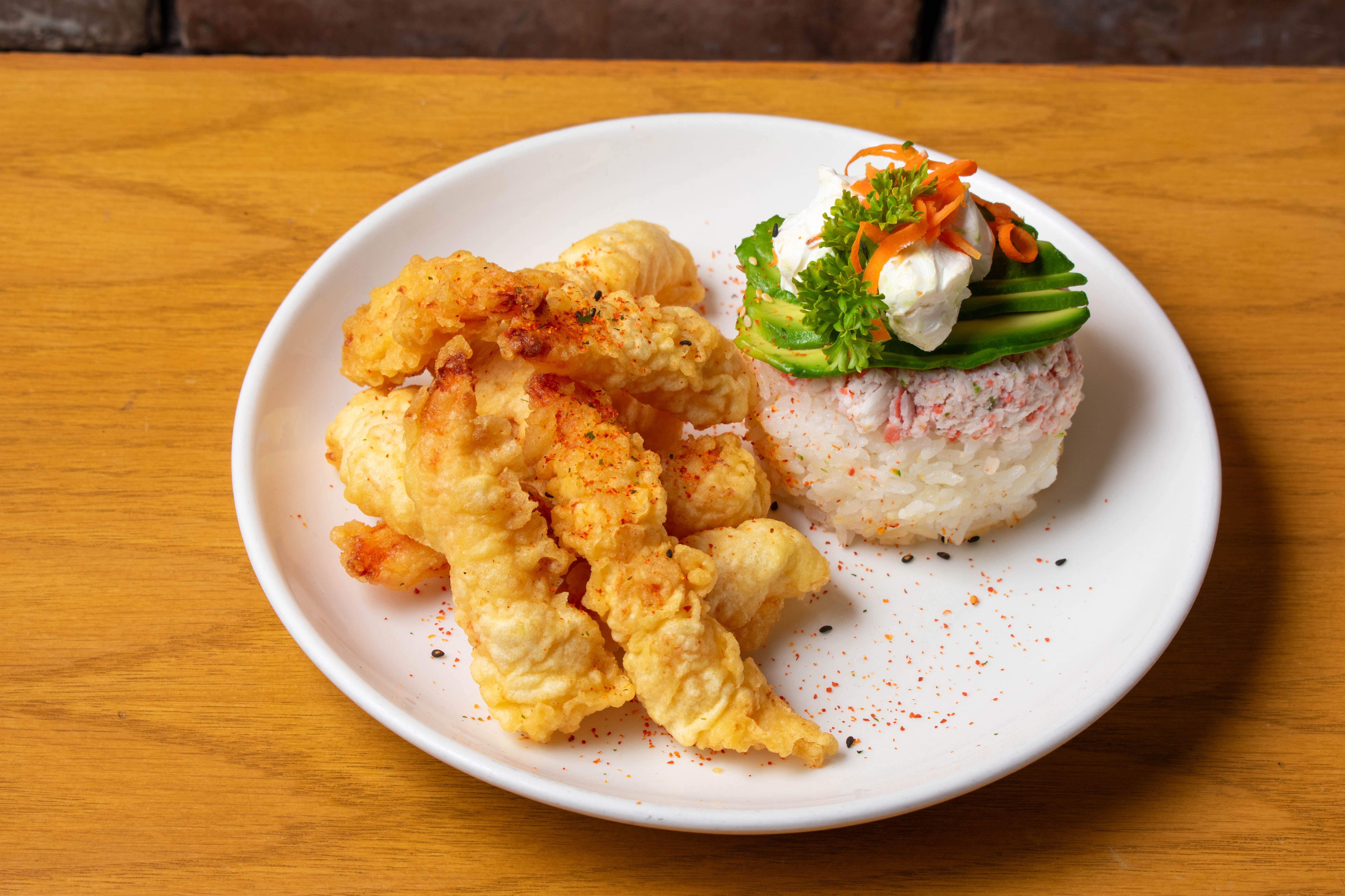 pechuga de pollo en tempura sobre una base de arroz, acompañada de tampico, queso crema, cebollín y láminas de aguacate. Todo bañado en una salsa spicy.