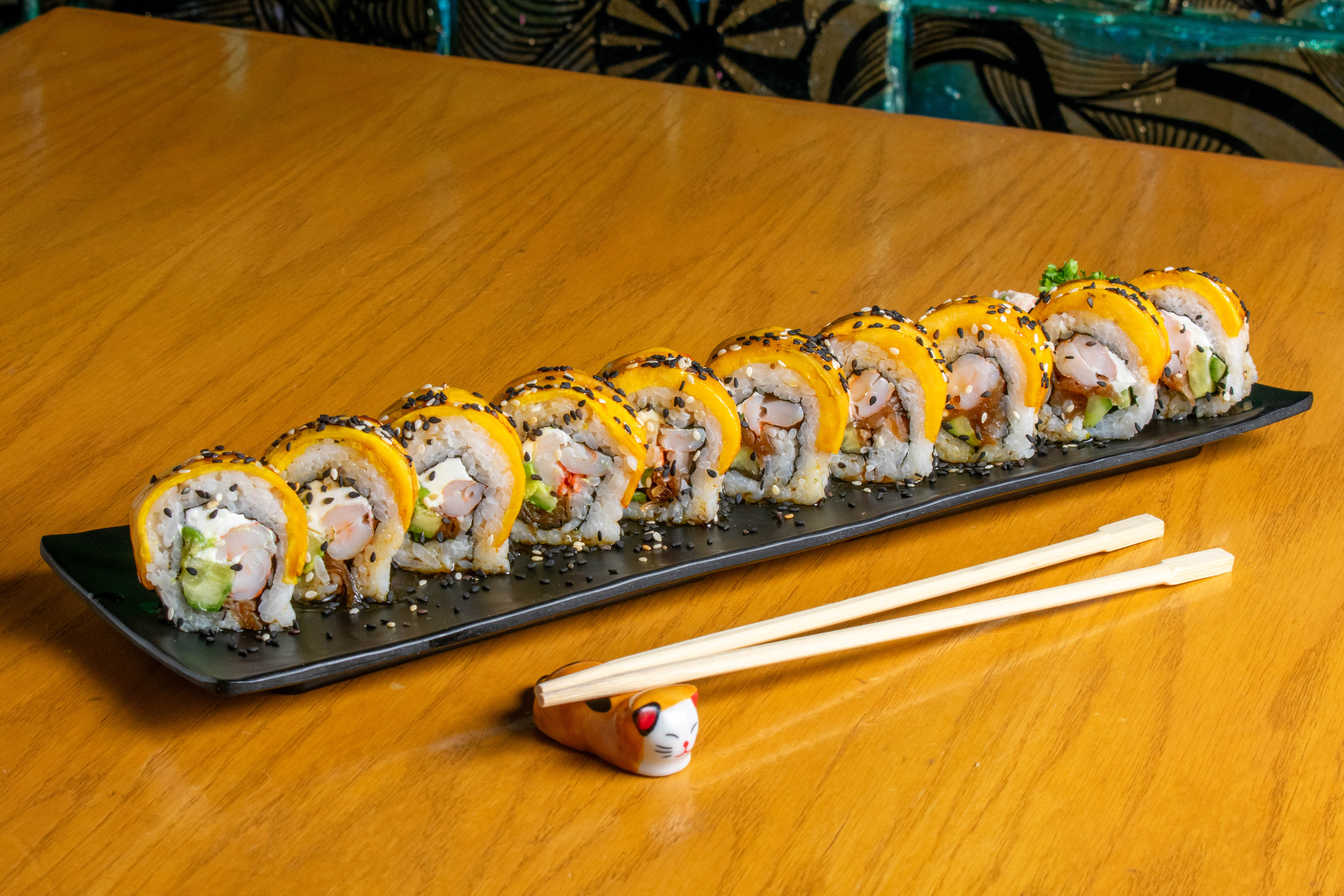 Un rollo con camarón, camarón empanizado, tampico, queso crema y aguacate. Todo envuelto en alga nori con arroz y un toque de salsa de anguila.
