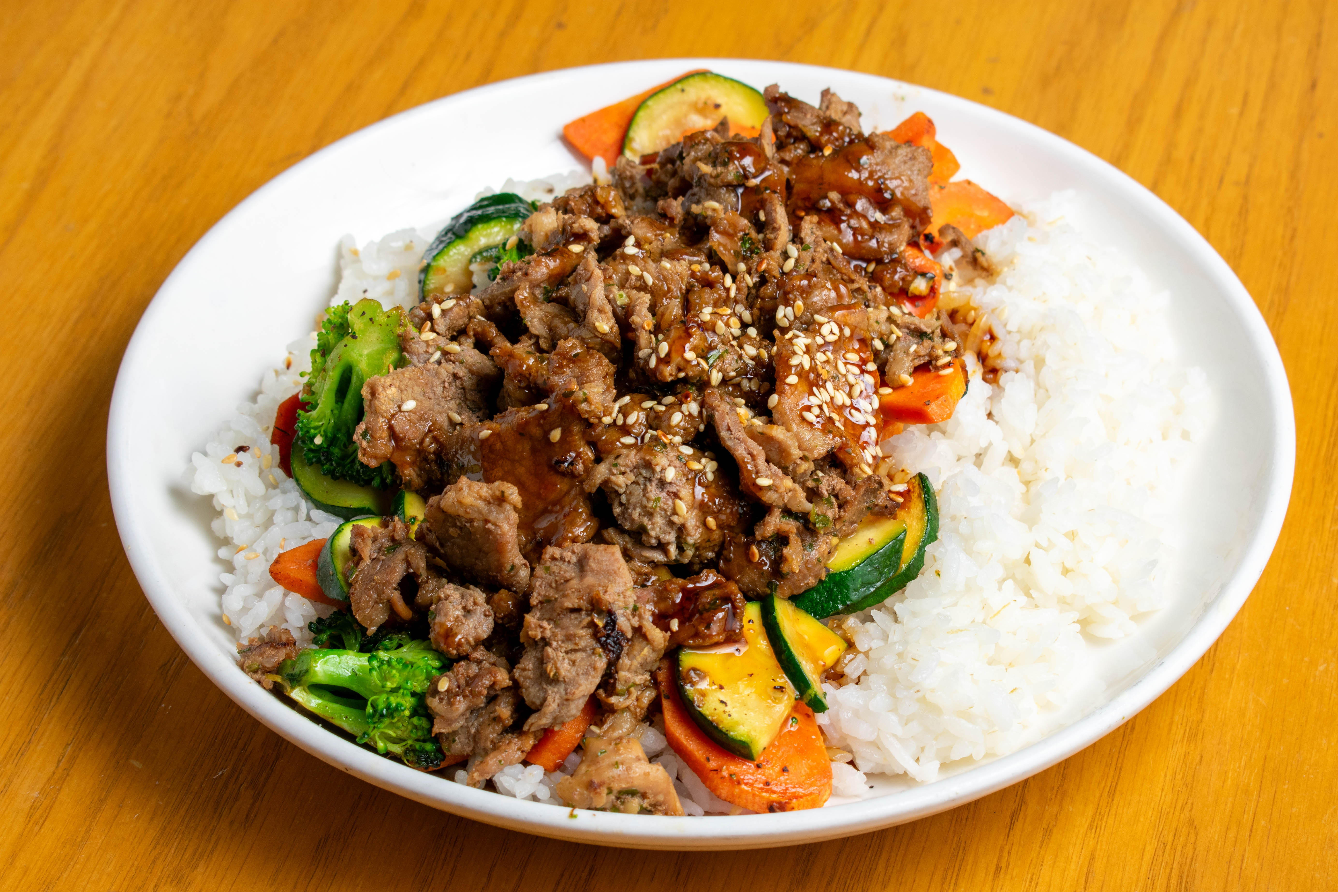 arroz, pierna y muslo de pollo, res y verduras mixtas, todo salteado en salsa teriyaki y terminado con ajonjolí.
