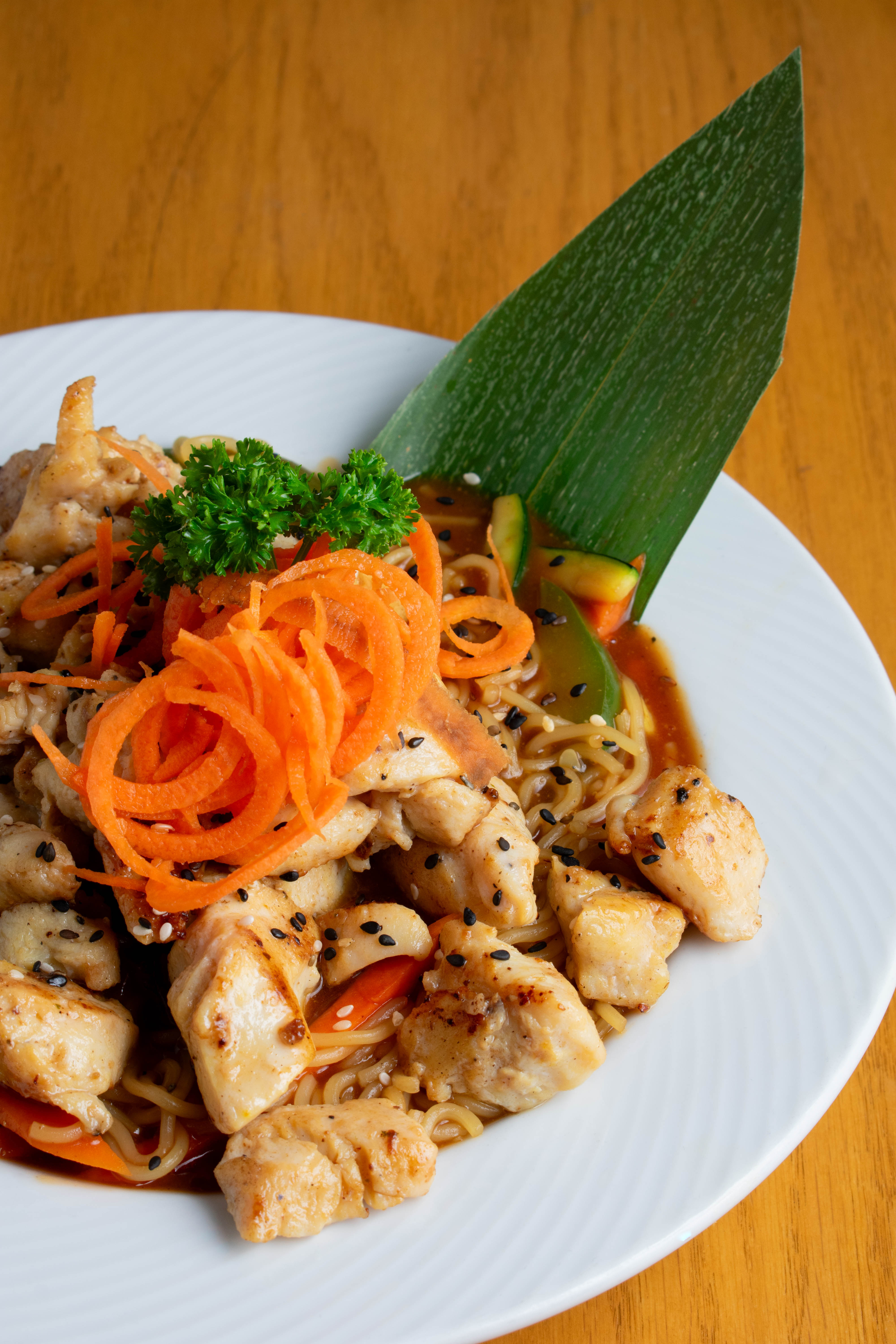 Salteado de pollo con verduras mixtas y arroz al vapor, sazonado con salsa teriyaki, vino blanco y un toque de especias orientales. Se acompaña con cinco rollos California.