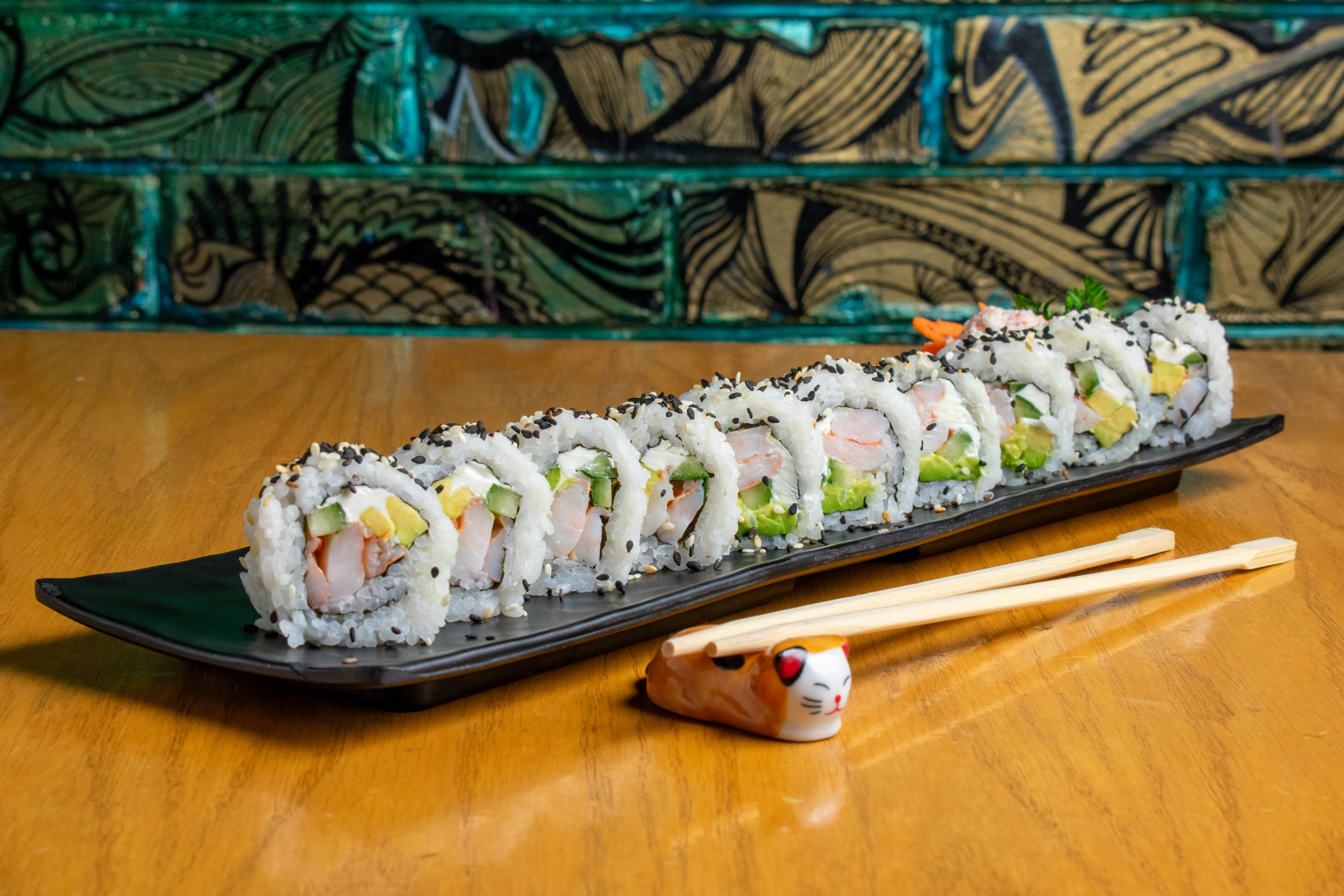 rollo de camarón cocido, combinado con aguacate, pepino y queso crema, envuelto en arroz y alga nori.