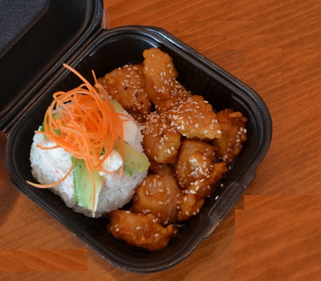 Rica combinación de Teriyaki con 5 bocadillos de California Roll empanizado. (2pzas)