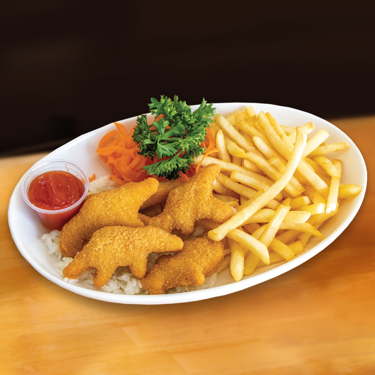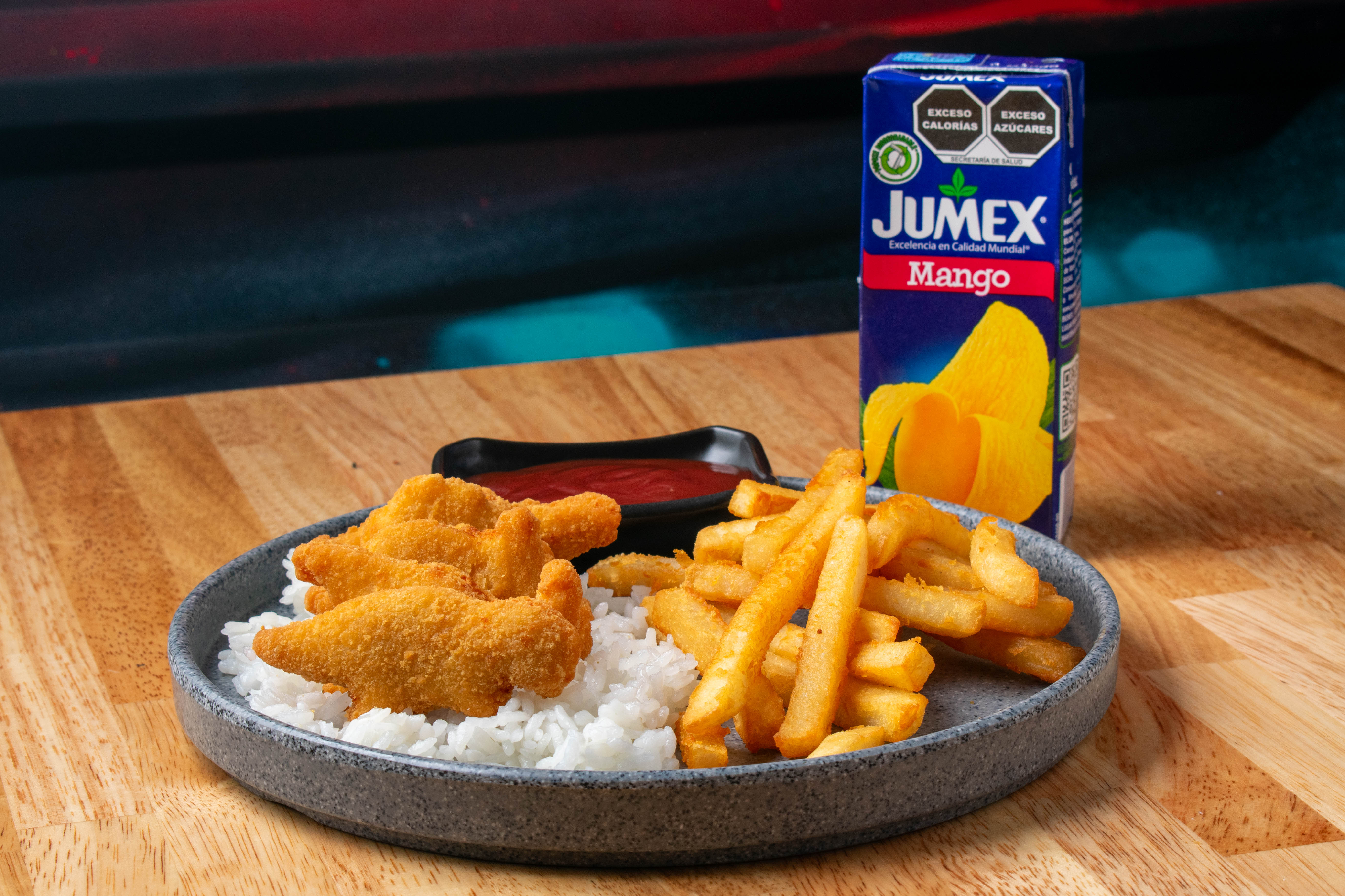 Nuggets de pollo, sobre camita de arroz, papitas a la francesa y juguito