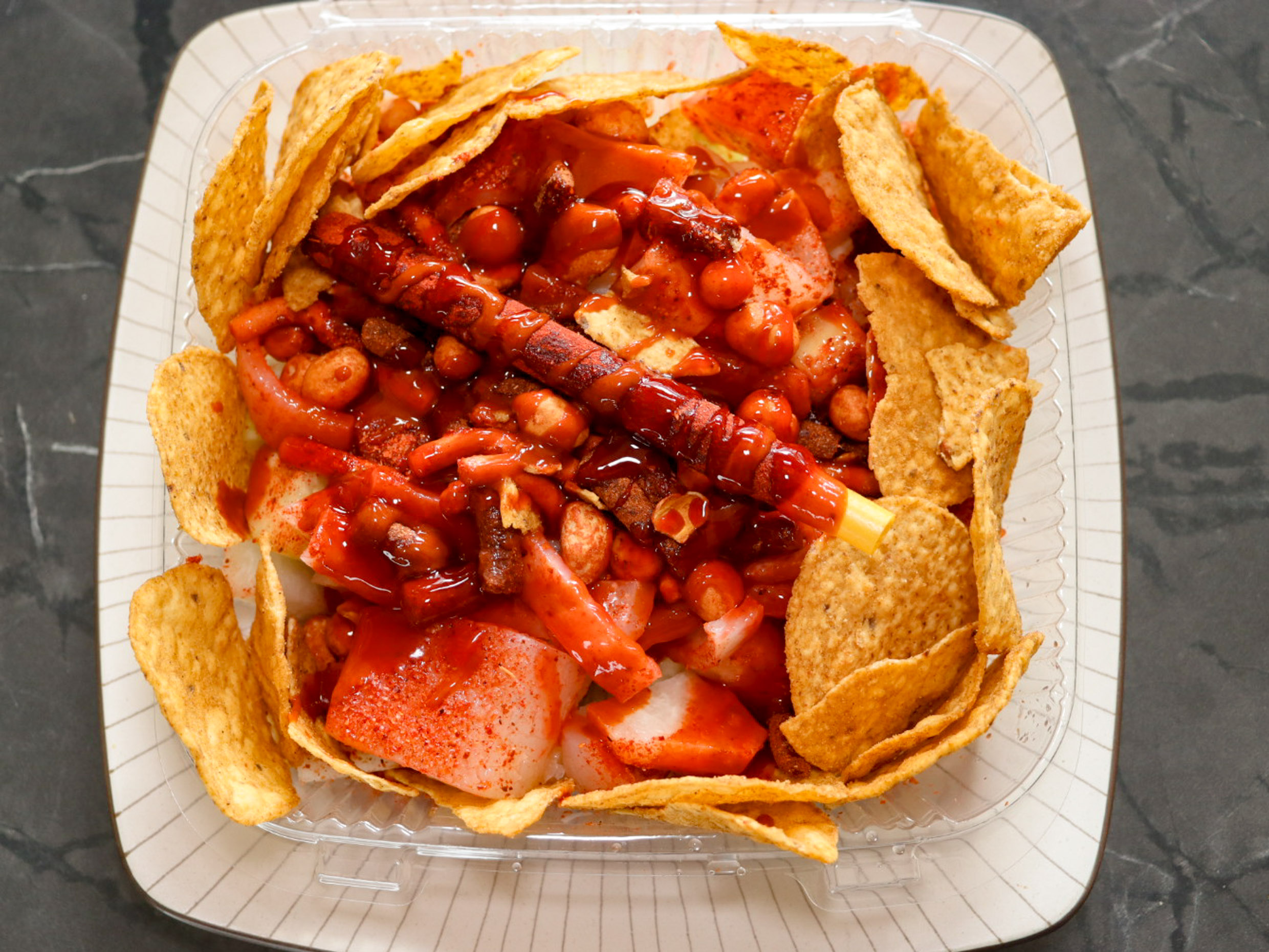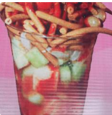 Preparados con pepino, jícama, cueritos, cacahuates japoneses, chaca chaca, tajín, limón, salsa chamoy y clamato.