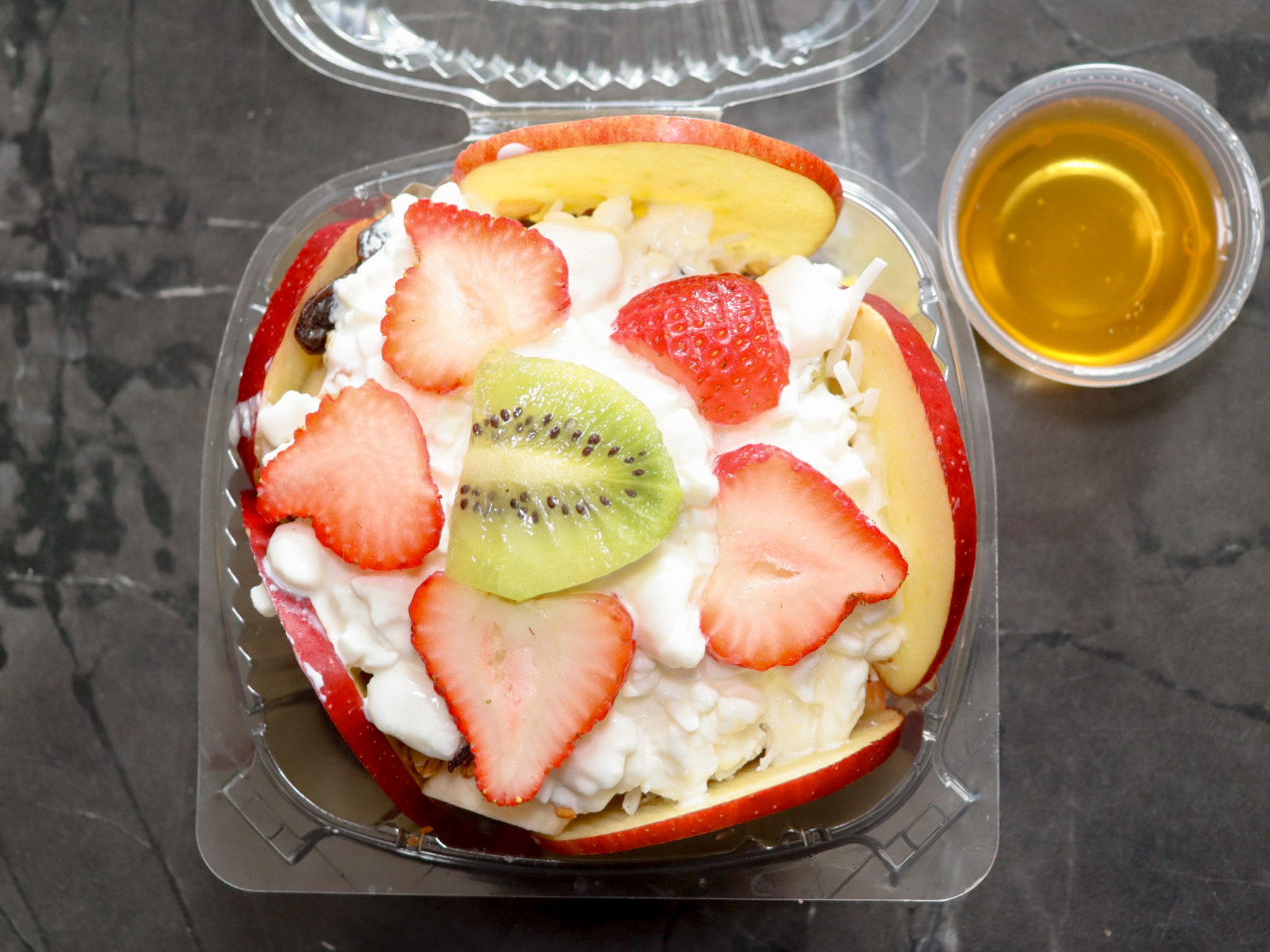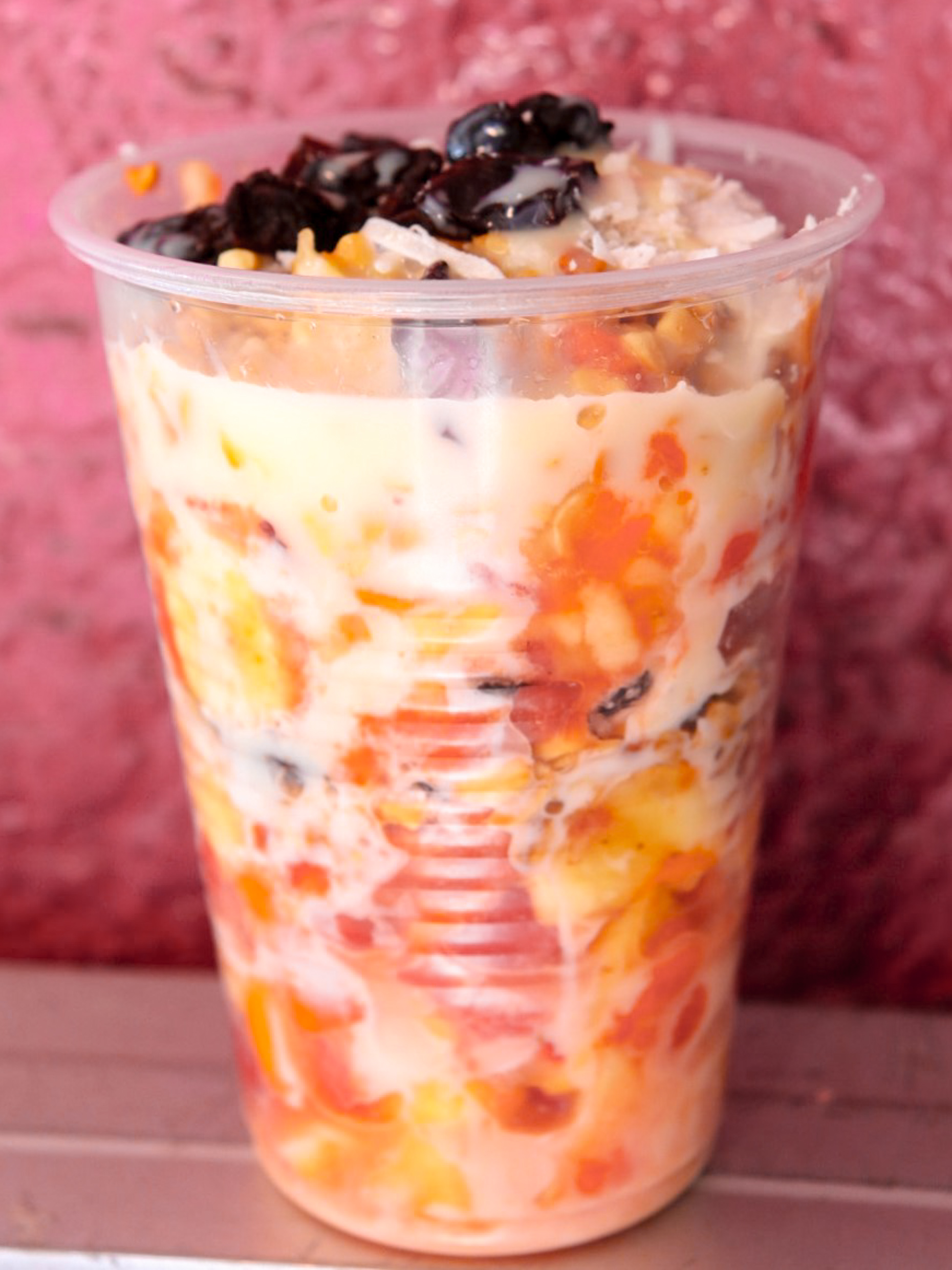 Con plátano, fresa, melón, piña, papaya, manzana, sandia y cereales granola, pasas, coco rayado y cacahuate picado.