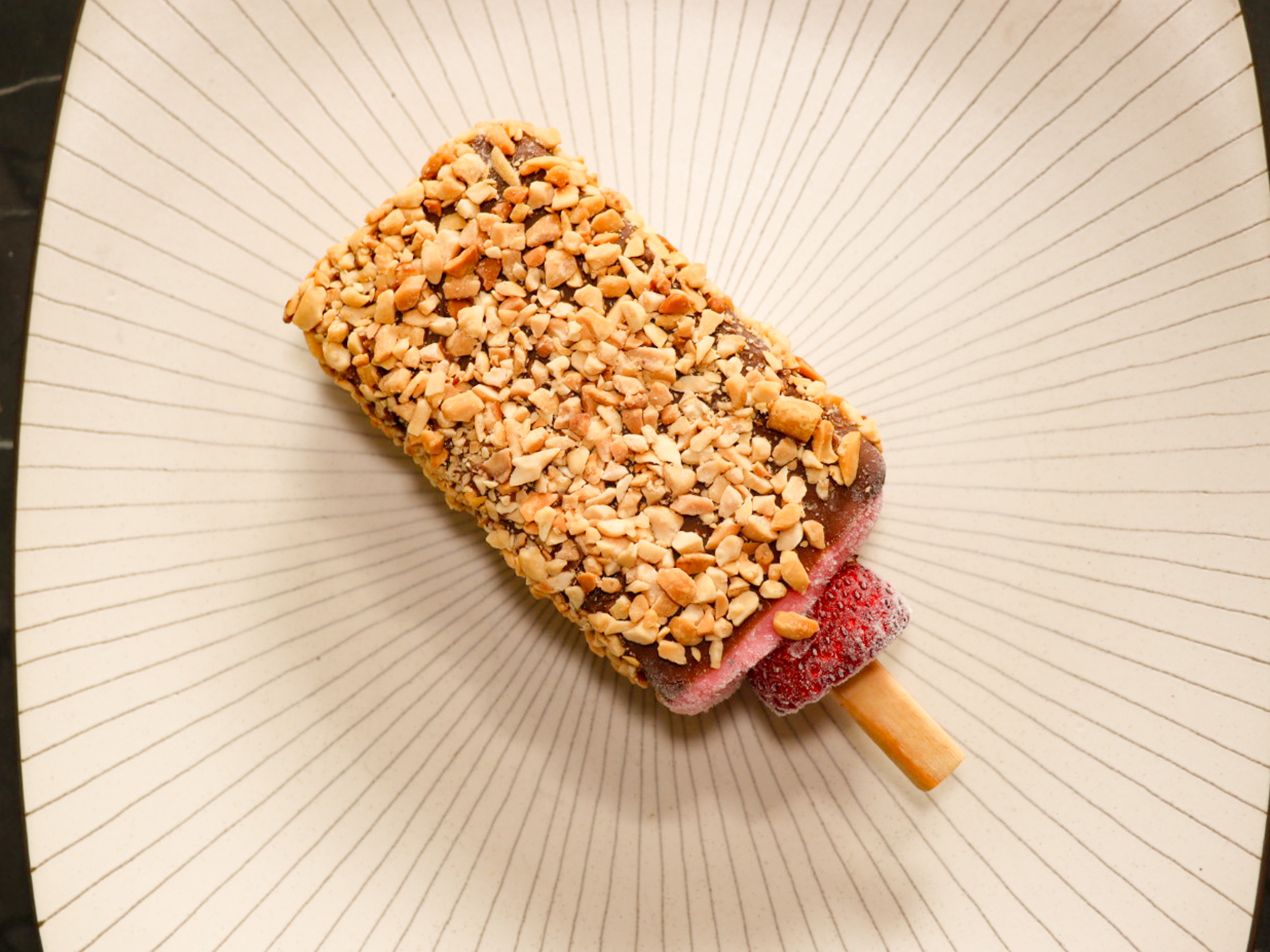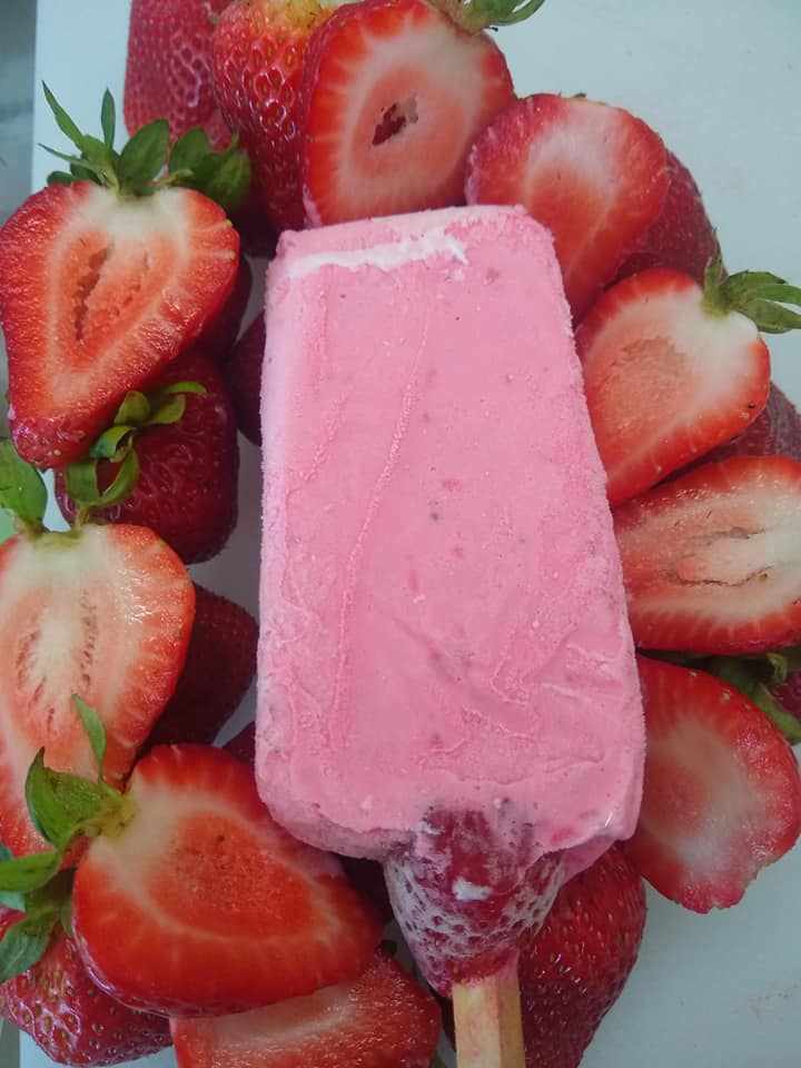 Paleta cubierta de chocolate con cacahuate picado, sabor fresa, vainilla, coco, nuez, pistaches, fresas con crema y galletas oreo.