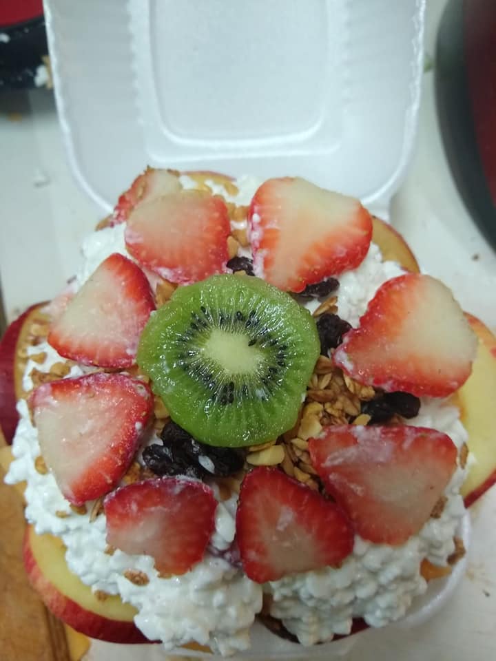 Con plátano, fresa, melón, piña, papaya, manzana sandia, cubiertas con cereales, queso cotage y miel.