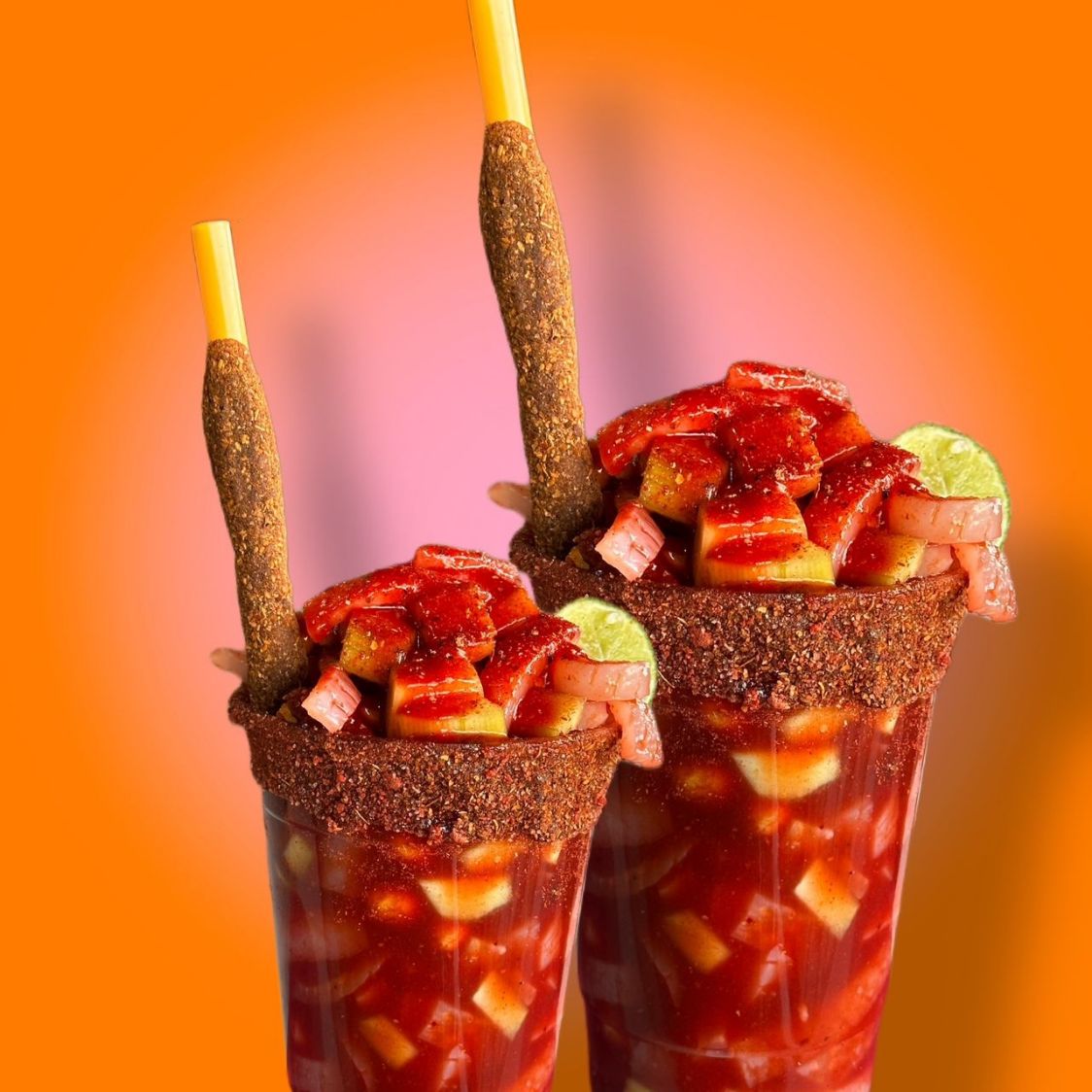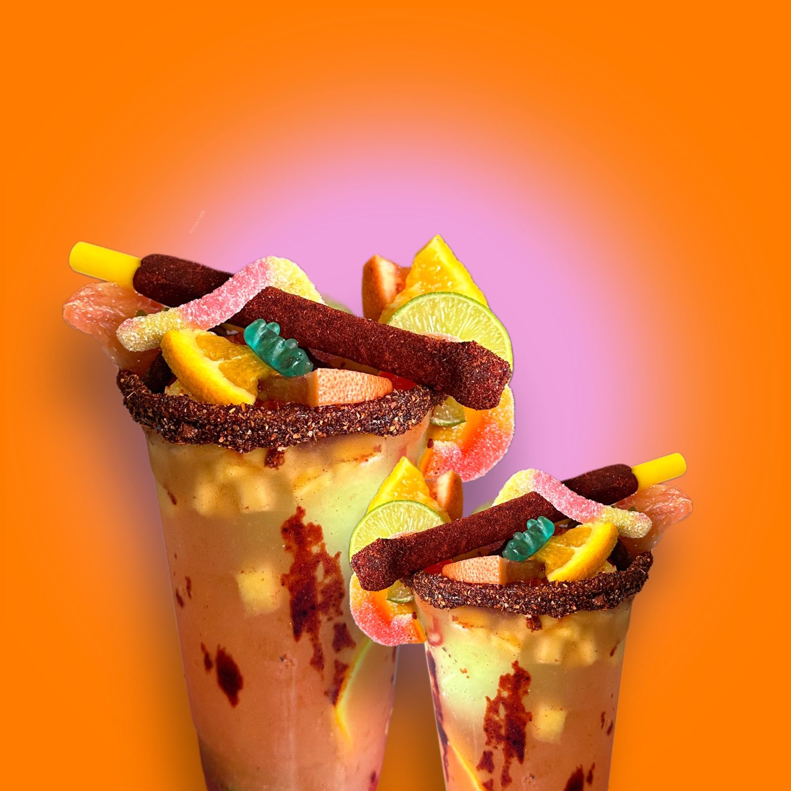 Vaso escarchado, soda Squirt, Monster, bola de nieve, trocitos de piña, chaca chacas, gomitas, Tajín, Miguelito y chamoy. Decoración de fresa, naranja y limón (mencionar si hay alergias).