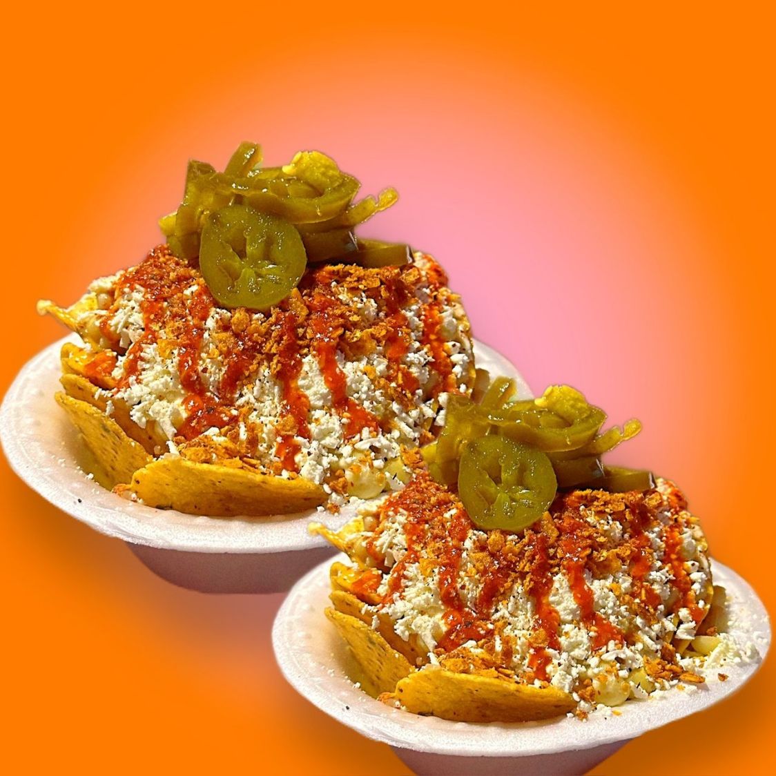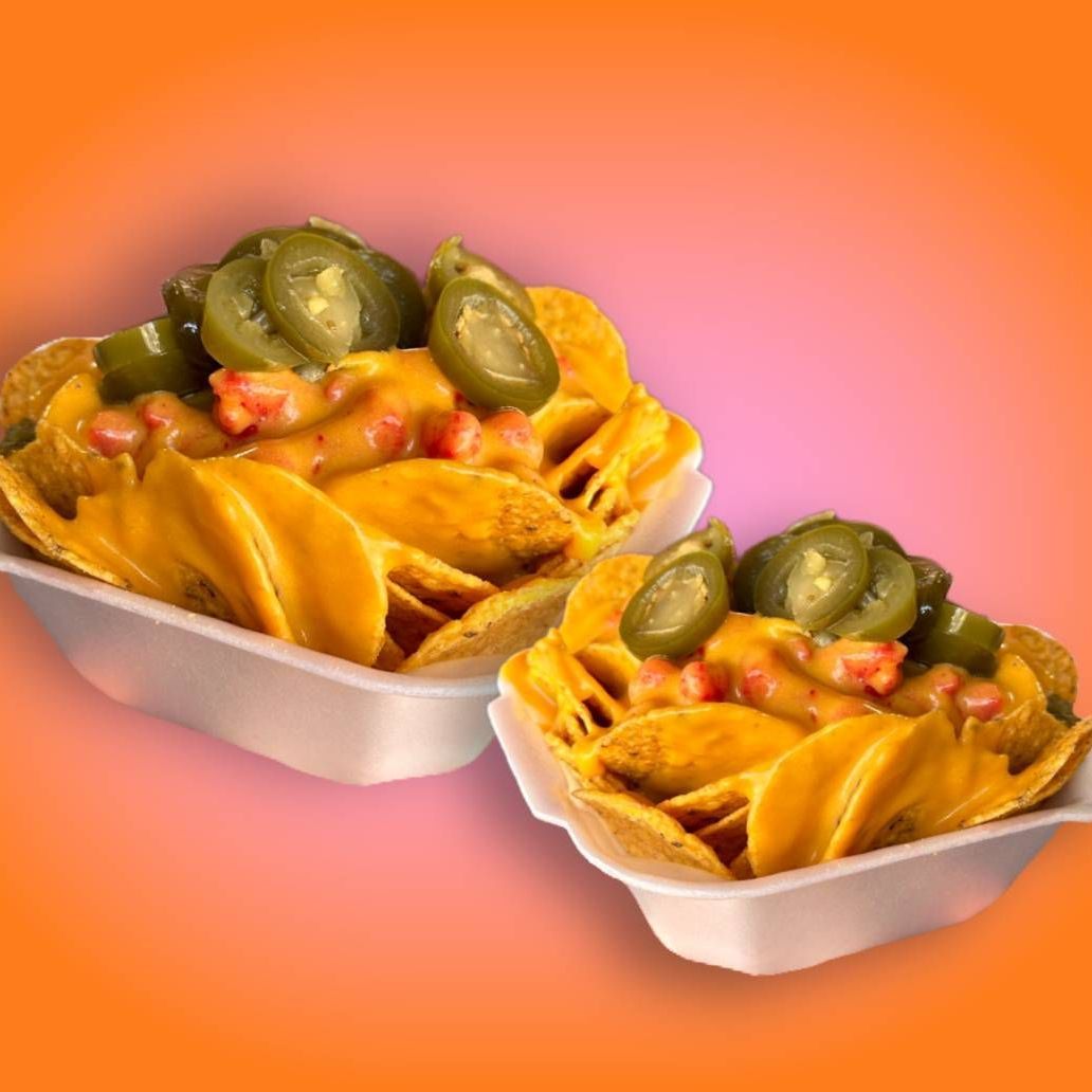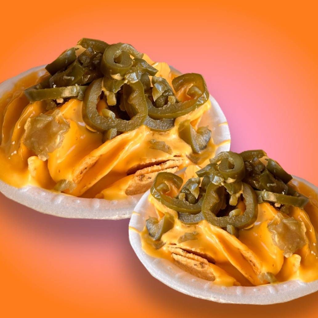 Tostinachos bañados en queso de nacho, elote, mantequilla, mayonesa, queso seco, salsa, Tajín y jalapeños. (Todo va aparte)