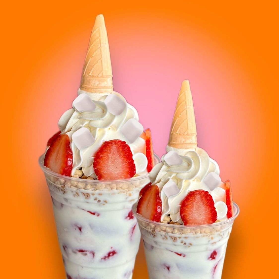 Fresas congeladas en vaso de 14 oz, crema de la casa, crema batida, galleta y cereales.