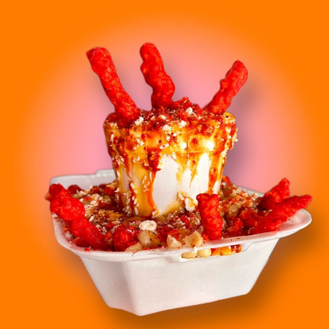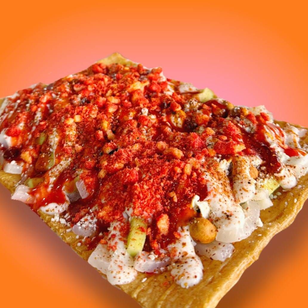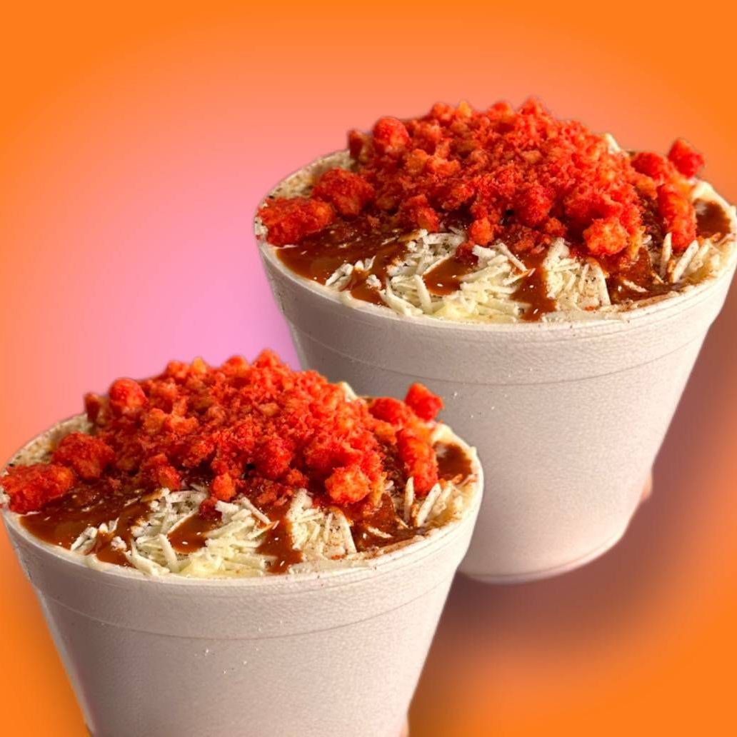 Tostinacho y Cheetos Flamin' Hot con queso amarillo, queso seco y jalapeños.