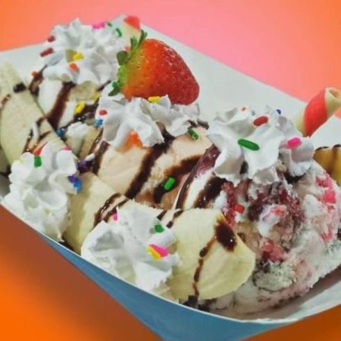 Banana, 3 bolas de nieve, crema batida, chocolate líquido, chispas, galleta, fresa como decoración y cacahuate.
