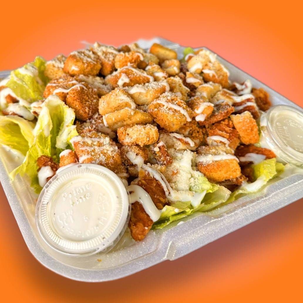 Lechuga romana, aderezo ranch, queso parmesano, pechuga spicy y crutones. En charola 8 por 8.
