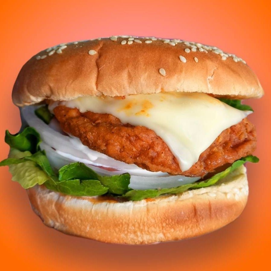 Pan de hamburguesa, lechuga, tomate, cebolla, aderezo ranch, pechuga empanizada spicy, queso suizo mayonesa y cátsup.