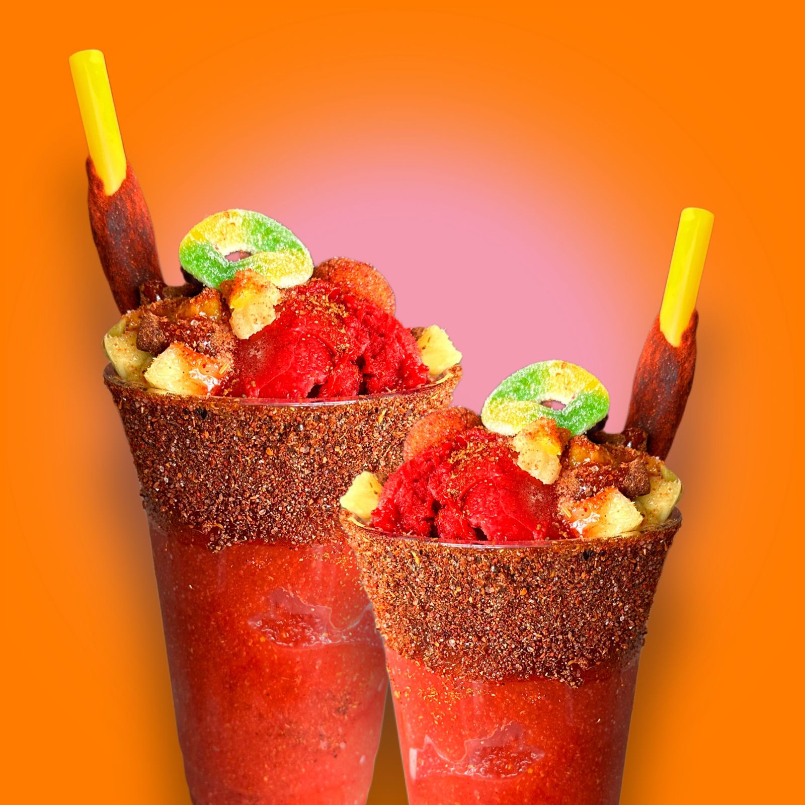 Bebida elaborada a base de soda y cítricos, gomitas, chaca chacas, piña, chamoy, Tajín, Miguelito, tarugo y bolita de nieve del sabor de tu elección, 32 oz.