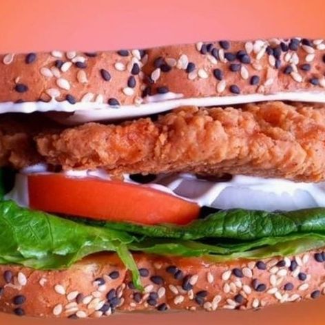 Pan de sándwich, mayonesa, aderezo de la casa, lechuga, tomate, cebolla, aderezo ranch, pechuga de pollo empanizada picante y queso manchego.